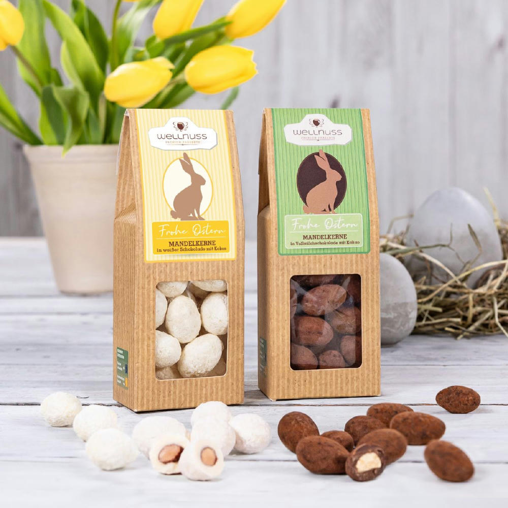 Ab 100 Stück mit Ihrem Motiv auf dem Baumwollsäckchen: Beweisen Sie Ihren Geschmackssinn und verschenken Sie eine Oster-Edition der Trüffelmandeln mit Kakao und Kokosmandeln mit weißer Schokolade. Deren perfekte Osterei-Form wird abgerundet mit Oster-Motiven auf der Faltschachtel. Sie suchen eine andere Größe? Dieses Premium Präsent ist auch mit 1, 2 oder 3 Faltschachteln erhältlich.