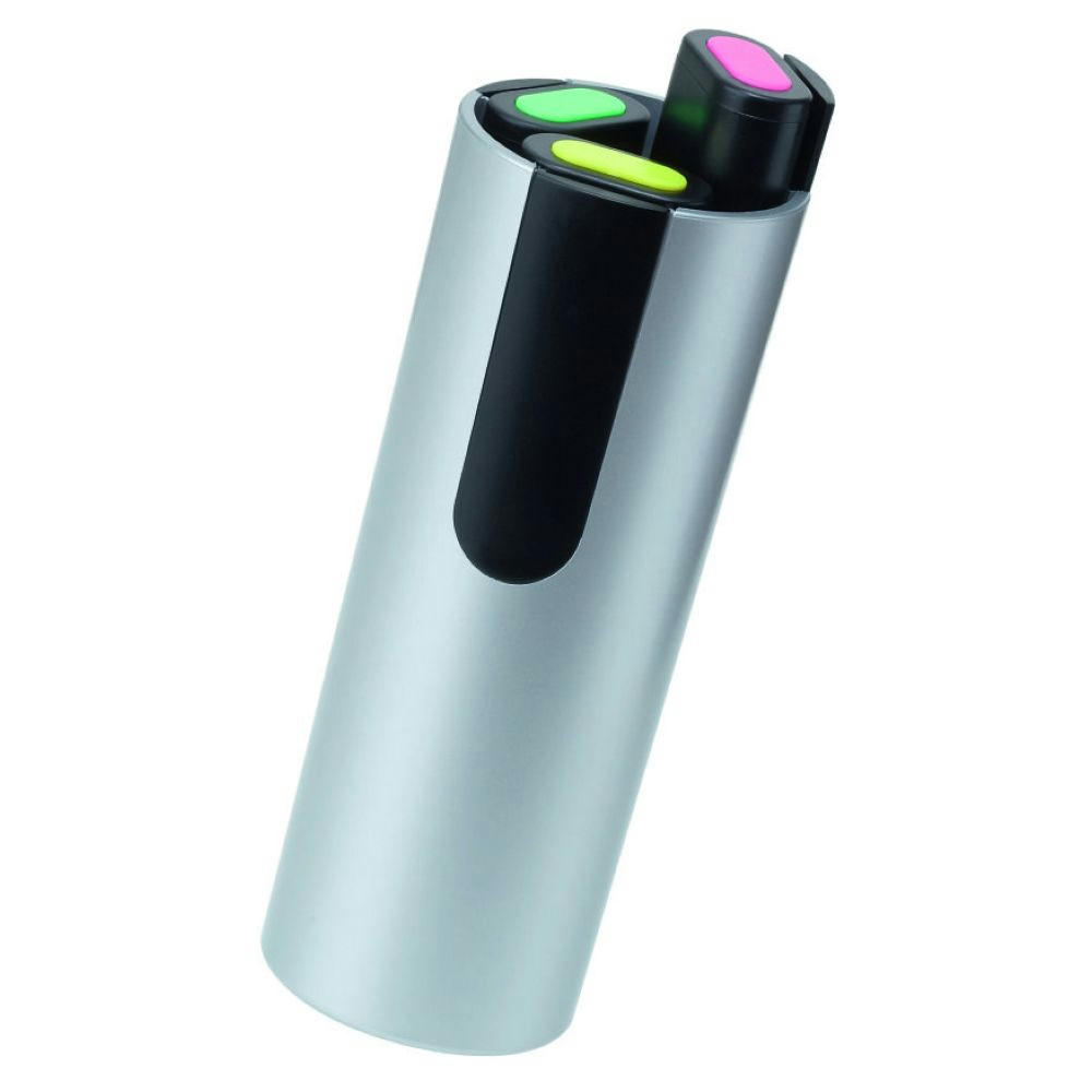 Silberne Set-Box in Köcherform mit 3 Textmarkern (0-0200) in verschiedenen Schreibfarben (gelb/grün/magenta). Auch mit Klebebanderole erhältlich (Preis auf Anfrage).