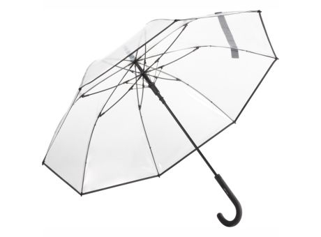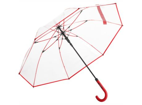 Ansprechender Automatik-Stockschirm mit transparentem Bezug und farbigen Details. Komfortable Automatik-Funktion zum schnellen Öffnen, hochwertiges Windproof-PLUS-System für eine maximale Gestell-Flexibilität bei stärkeren Windböen, flexible Fiberglasschienen, farblich aufeinander abgestimmte Design-Elemente, handsympathischer Soft-Touch-Rundhakengriff mit integrierter Auslösetaste und Werbeanbringungsmöglichkeit, höherer Korrosionsschutz durch schwarze Galvanisierung des Stahlstocks