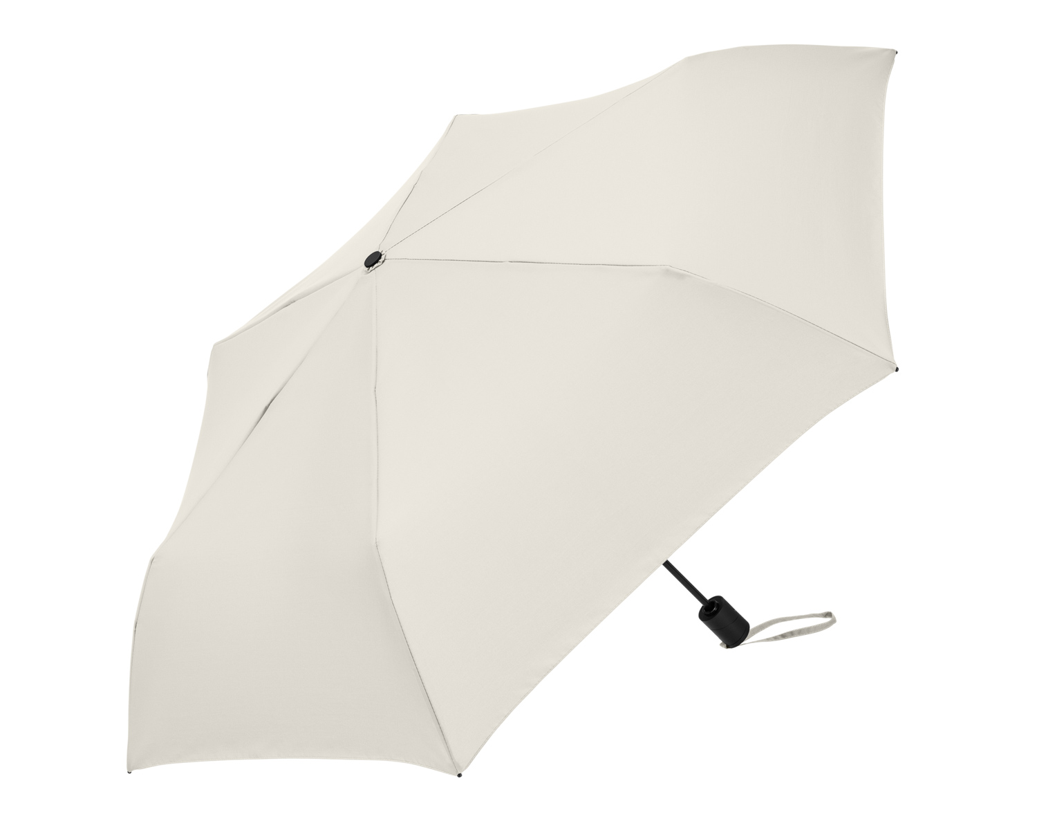 Filigraner Doppelautomatik-Taschenschirm in superleichter Ausführung. Komfortable Automatik-Funktion zum schnellen Öffnen und Schließen, hochwertiges Windproof-PLUS-System für eine maximale Gestell-Flexibilität bei stärkeren Windböen, schwarzer Aluminiumstock, wassersparend gefärbtes Polyester-Pongee waterSAVE® Bezugsmaterial aus recycelten Kunststoffen, mit waterSAVE® Label auf dem Schließband, matt-schwarzer Kunststoff-Softfeel-Griff mit Auslösetaste und Werbeanbringungsmöglichkeit, handtaschentauglich durch superleichtes Gewicht und kompakte Größe