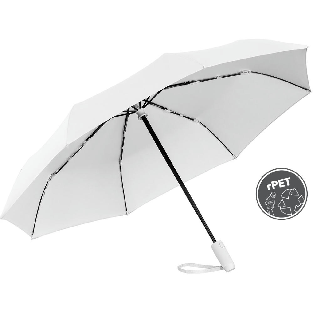 Komfortable Doppelautomatik-Funktion zum schnellen Öffnen und Schließen, hochwertiges Windproof-PLUS-System für eine maximale Gestell-Flexibilität bei stärkeren Windböen, flexible Fiberglasschienen mit weißen Design-Elementen, stabiler Stahlstock, Polyester-Pongee Bezugsmaterial aus recycelten Kunststoffen, formschöner Soft-Feel-Griff mit Trageschlaufe in Bezugsfarbe und weißen Design-Elementen mit integrierter Auslösetaste und Werbeanbringungsmöglichkeit