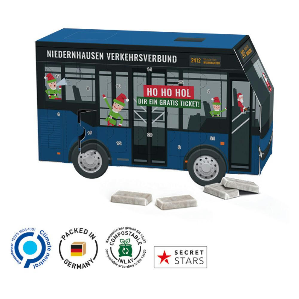 Adventskalender Bus in Vollkartonhülle mit kompostierbarem Inlay, rundum individuell bedruckt. Inhalt: 24 Ritter SPORT Schokowürfel, variierende Mischung aus den Sorten : Schoko Crisp, Mousse au Chocolat, Vollnuss in Nugatcreme, Karamell Duo, 192 g.