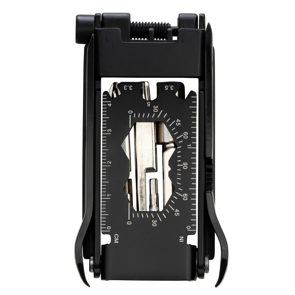 Mit Sechskantschlüssel, Sechsrundschlüssel, KettenSCHNEIDER, Werkzeug zum Reifen-/Schlauchwechsel und Flaschenöffner, Lineal sowie Winkelmesser.