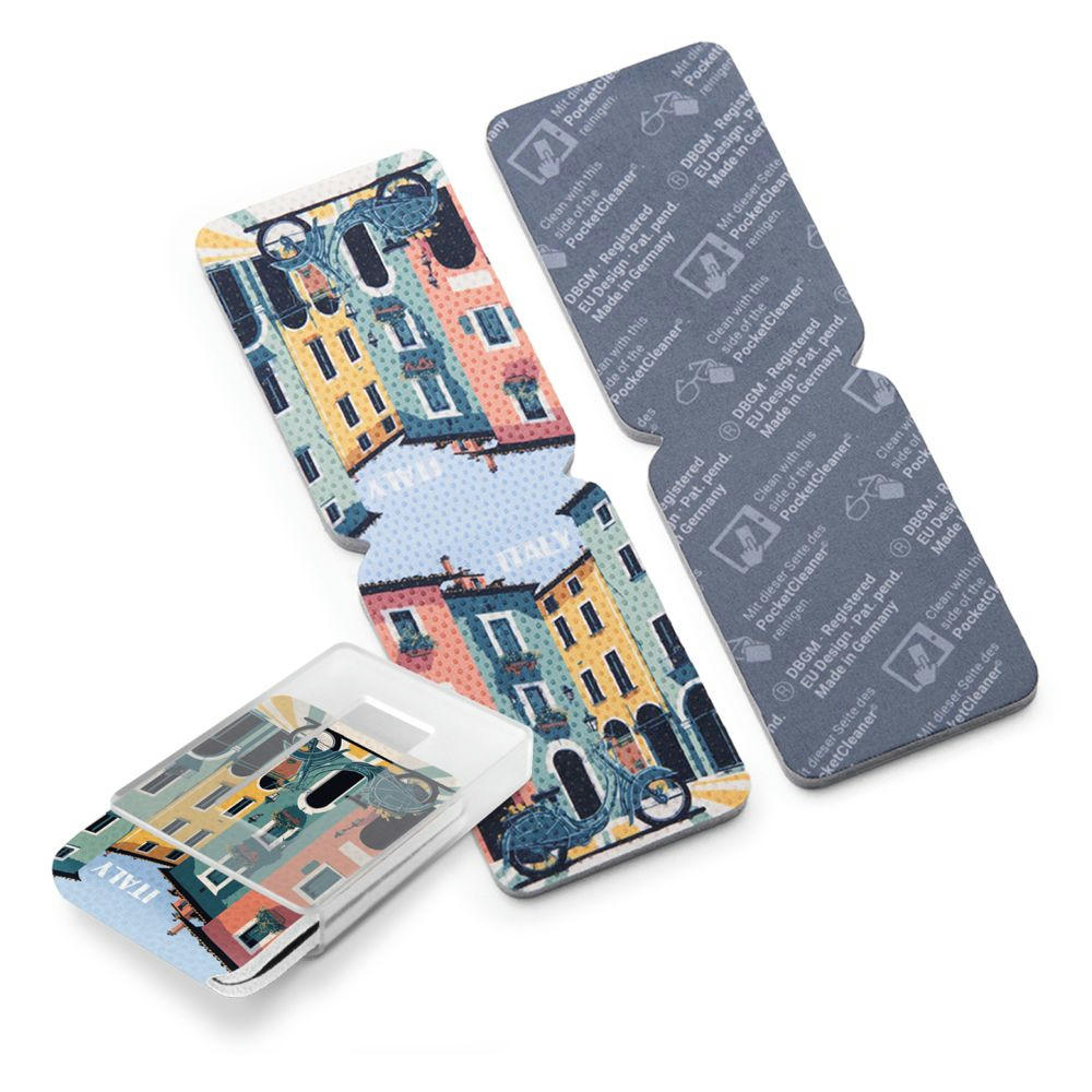 Die verarbeitete P-9000® Microfaser entfernt Fingerabdrücke und Schlieren äußerst effektiv. Feine Grip-Dots auf der Außenseite verhindern das Verrutschen der Finger. Der PocketCleaner® wird im kompakten Case inkl. individuellem, mehrfarbigen HD-Werbeaufdruck geliefert. Made in Germany. Preis inkl. 4/0 Druck sowie inkl. Druckvorlauf- und Versandkosten an eine Adresse in Deutschland auf dem Festland.