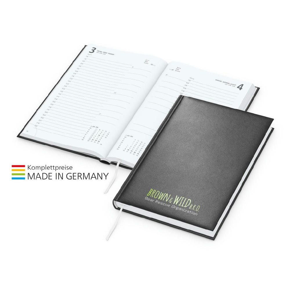 Preiswert und reduziert auf das Wesentliche: Buchkalender Advance mit 416 Seiten und Kalendarium in Anthrazit. Volle Funktion, kleiner Preis.