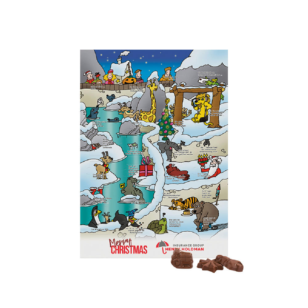 Rätsel Adventskalender in Vollkartonhülle, Querformat, recycelbar, mit Rätselmotiv "Weihnachtsdinner". Im unteren Teil des Kalenders ist Platz (Ca. 345 x 25 mm mm) für dein Logo und deinen individuellen Weihnachtsgruß. Ein Teil des Ertrags dieses Kalenders unterstützt die Albert Schweitzer Kinderdörfer und Familienwerke. Inhalt: 24 Friedel Vollmilch Schokoladentäfelchen, 70 g.