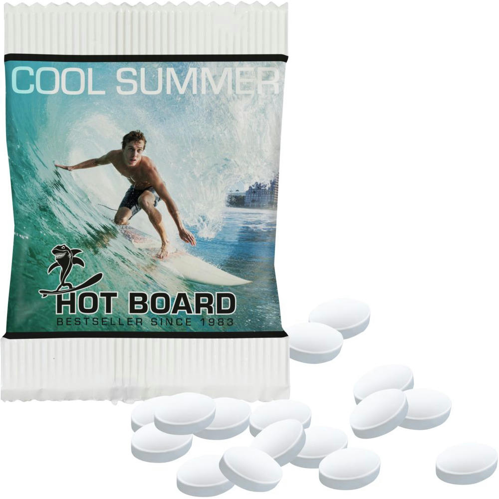 Samtig abgerundete und zuckerfreie Pastillen (ca. 1,6 kcal pro Pastille), oval 13 x 10 mm, mit Eisbonbon-Geschmack, in weißem Papierwerbetütchen verpackt. Inhalt: Cool Ice zuckerfreie Pastillen, oval 13 x 10 mm. Format: ca. 85 x 60 mm. Haltbarkeit: ca. 9 Monate bei sachgerechter Lagerung. Inkl. 1-4-Druck.