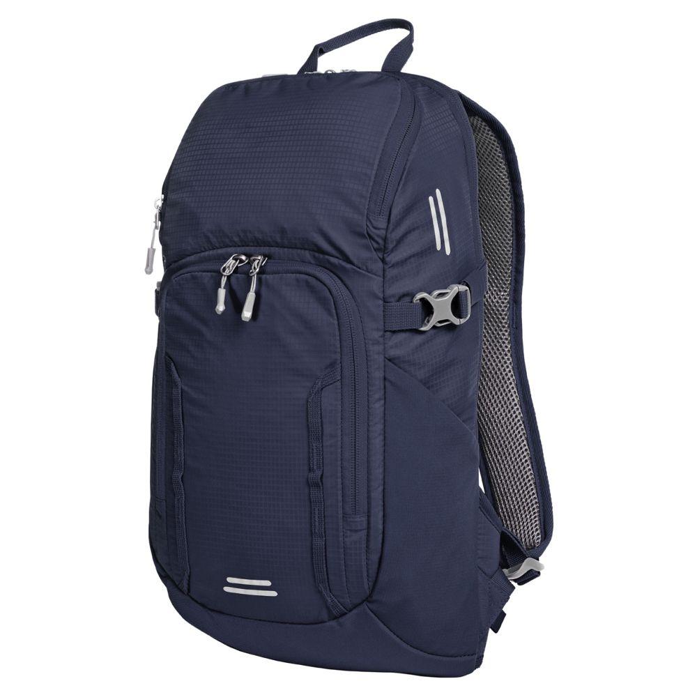 leichter, funktioneller Tages- und Bike-Rucksack mit innovativem Waben-Rückensystem für ideale Belüftung und Polsterung; höhenverstellbarer Brustgurt; seitlich gepolsterter Beckengurt; großes 2-Wege-Reißverschluss-Hauptfach mit flachem Einsteckfach innen; rückseitiger Ausgang geeignet für z.B. Kopfhörer oder Schlauch des zusätzlich lieferbarem Trinksystems (Artikel 1812216); Klettloop zur Fixierung des Trinkschlauches; 2 Reißverschlussvortaschen; 2 Netz-Seitentaschen; seitliche Zurrgurte; funktionales Schlaufenband auf der Fronttasche; dekorativer Reflex-Aufdruck, Handgriff