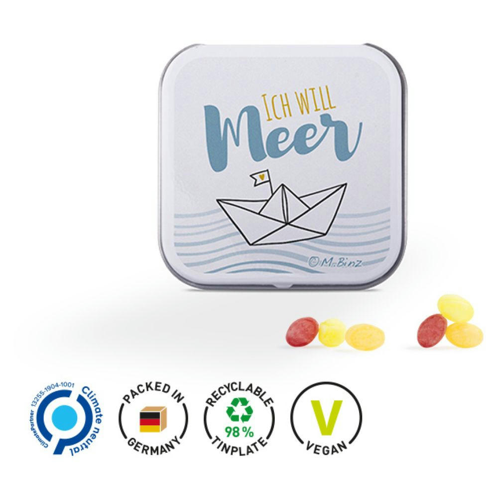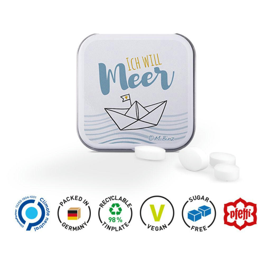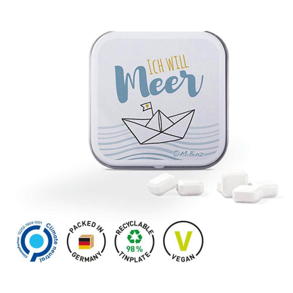 Quadratische weiße Metalldose mit Scharnierdeckel, Weißblech 98% recycelbar, individuell bedruckt. Inhalt: Cavendish & Harvey Mini Bonbons Japanisch Minze, 20 g.