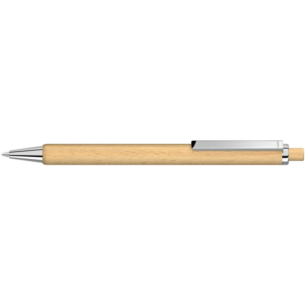 Holz-Druckkugelschreiber mit Holzdrücker, Metallclip und Metallspitze glanzverchromt. Schaft und Drücker aus schutzlackiertem PEFC-zertifiziertem Buchenholz.