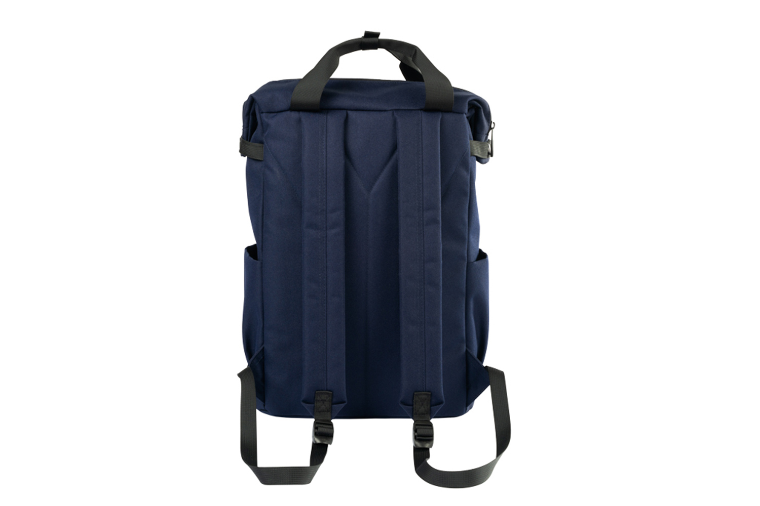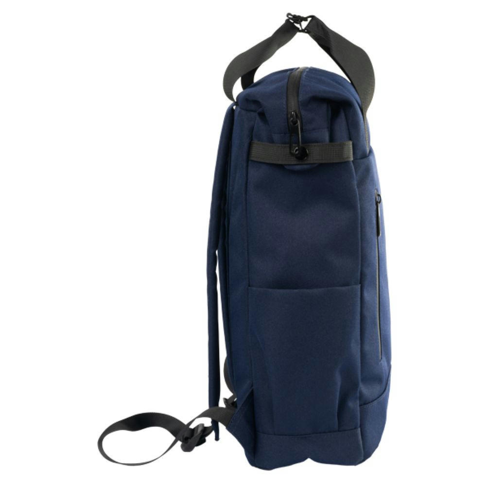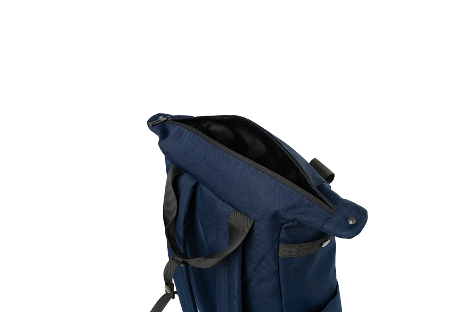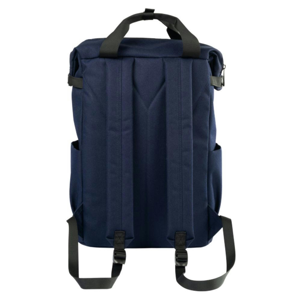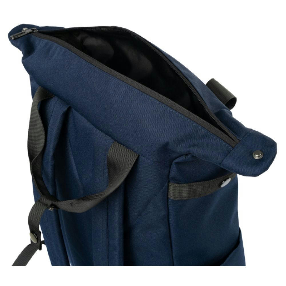 Mit schwarzen Accessoires, gummierter RV an Fronttasche, seitlich je ein Steckfach, gepolsterter Rücken, gepolsterte Träger, 2 Tragegriffe oben, Druckknöpfe seitlich am Hauptfach, Innen: gepolstertes Laptop-Fach mit 2 Steckfächern, ein großes RV-Netzfach.