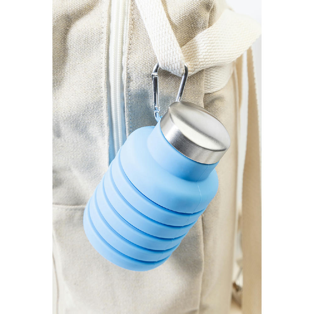 Faltbare Trinkflasche aus Silikon mit Deckel aus Edelstahl und Aluminium-Karabiner. Füllmenge: 500 ml.