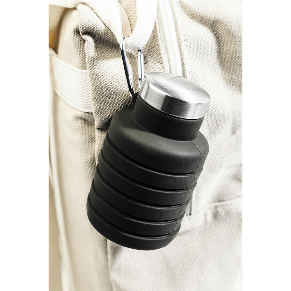 Faltbare Trinkflasche aus Silikon mit Deckel aus Edelstahl und Aluminium-Karabiner. Füllmenge: 500 ml.