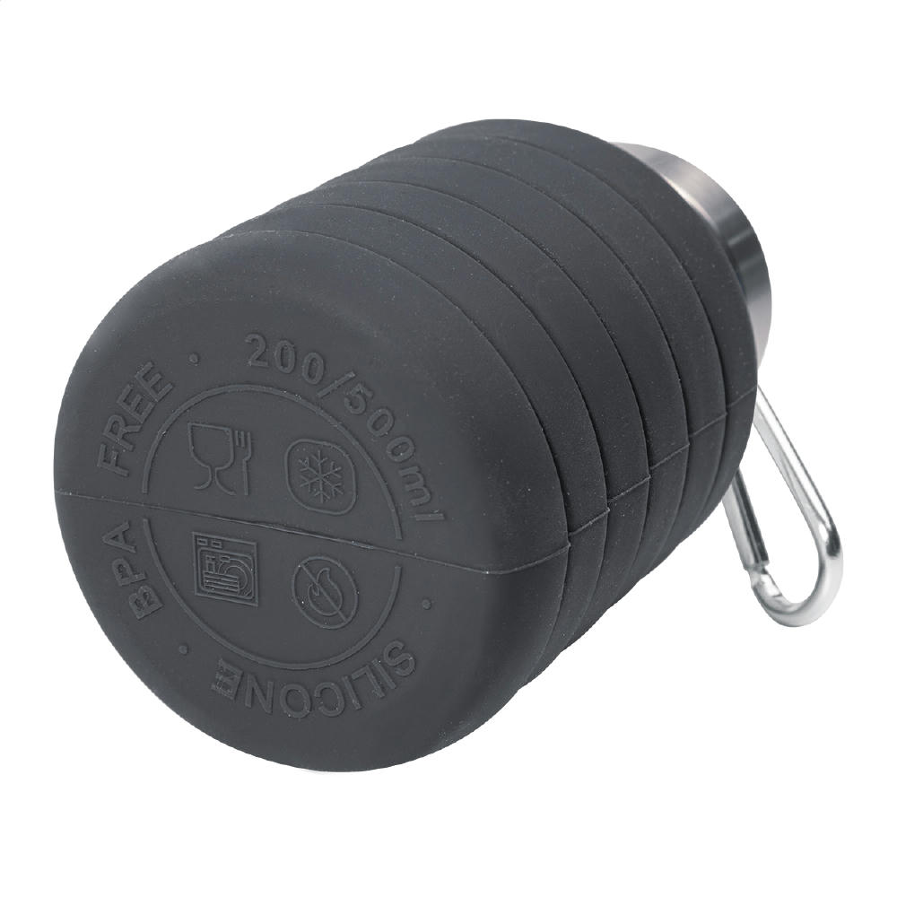 Faltbare Trinkflasche aus Silikon mit Deckel aus Edelstahl und Aluminium-Karabiner. Füllmenge: 500 ml.