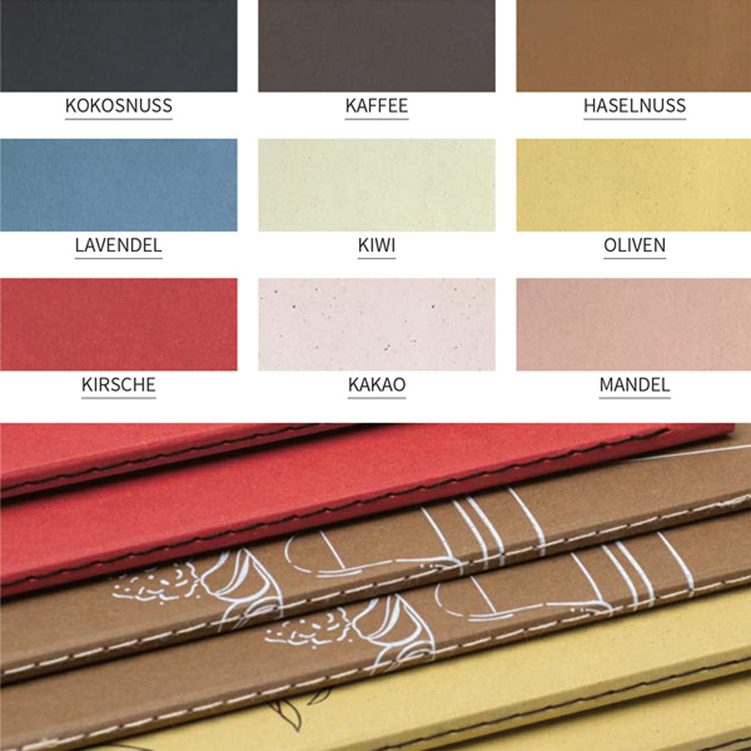 Die mit Faden genähten Notizhefte sind eine einzigartige und minimalistische Wahl für umweltbewusste Unternehmen und Marken. Der weiche Umschlag wird aus zertifiziertem "Organic Spirit"-Papier hergestellt, in dem ca. 15% der Zellulosemasse durch Abfälle pflanzlichen Ursprungs ersetzt werden. Zusätzlich enthält das Papier 40% Zellulose aus recyceltem Verpackungsmaterial und ist vollständig biologisch abbaubar und recycelbar. Die Herstellung der Organic Spirit Notizhefte basiert auf Nebenprodukten aus der Verarbeitung von Pflanzenabfällen wie Lavendel, Kaffee, Kirschen und Oliven, was jedem Produkt eine individuelle, natürliche Farbgebung verleiht. Zahlreiche Individualisierungsoptionen ermöglichen es Ihnen, Ihr nachhaltiges Notizheft frei nach Ihren Wünschen zu gestalten. Individualisierungsmöglichkeiten: Format, Einbandfarbe (Lavendel, Kaffee, Olive u.v.m), Papierart, Fadenfarbe, Werbeanbringung (Druck, Tief- oder Hochprägung).