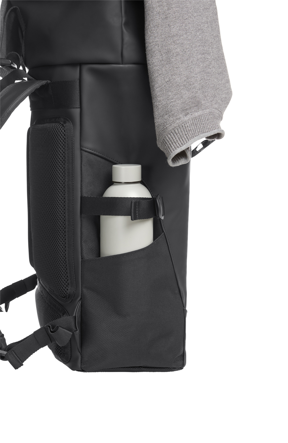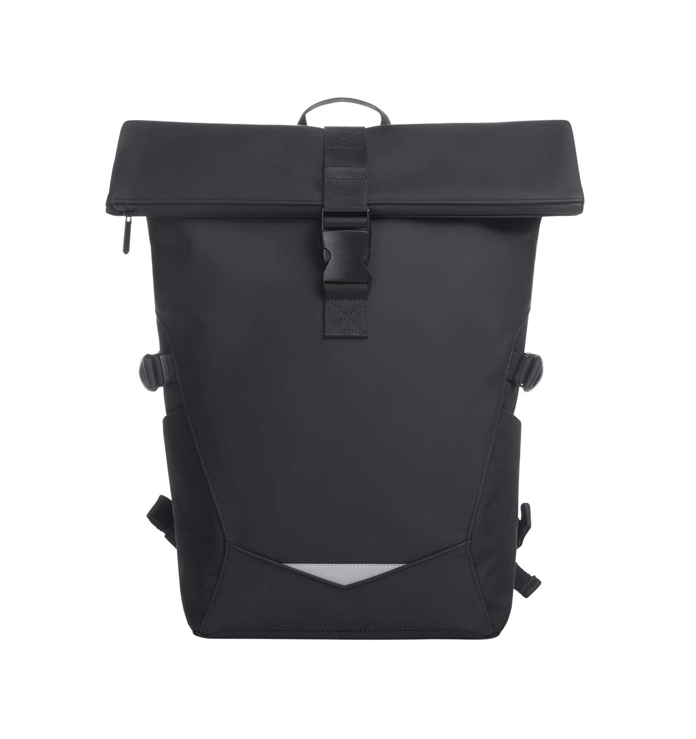 Rolltop-Rucksack; Reißverschluss-Hauptfach mit Steckverschluss; große Reißverschluss-Vortasche; zwei seitliche Einsteckfächer; Fixiergurte; Reflexeinsatz auf der Front; innen gepolstertes Einsteckfach mit Klettsicherung; verstecktes Reißverschluss-Fach rückseitig; gepolstertes Tragesystem mit individuell einstellbarem Brustgurt; Hand- sowie Tragegriff.