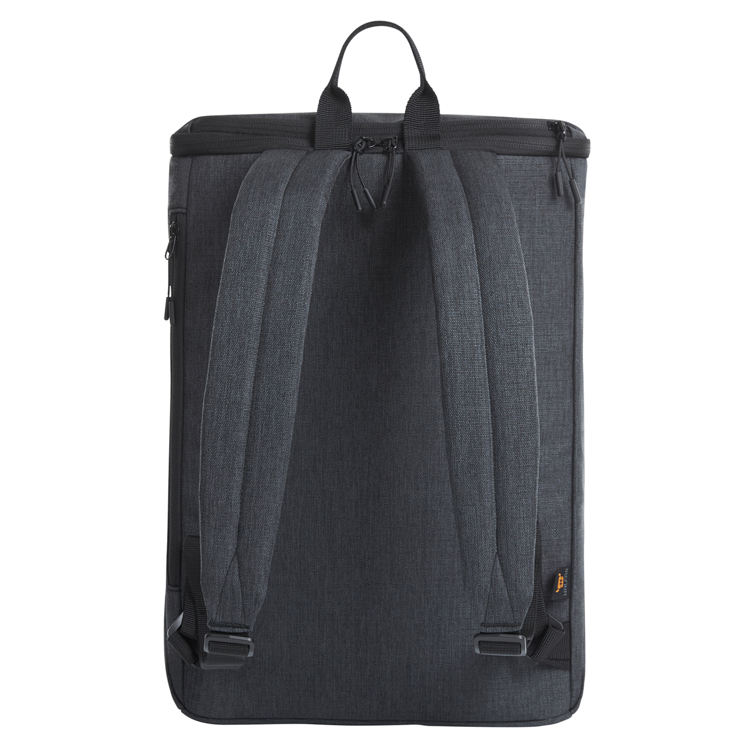 Toplader-Rucksack; 2-Wege-Reißverschluss-Hauptfach; gepolstertes Notebookfach; Einsteckfächer innen; Reißverschluss-Deckelfach; Reißverschluss-Vortasche mit verstecktem Reflex-Zipper und Grifflaschen; gepolstertes Tragesystem; Handgriff.