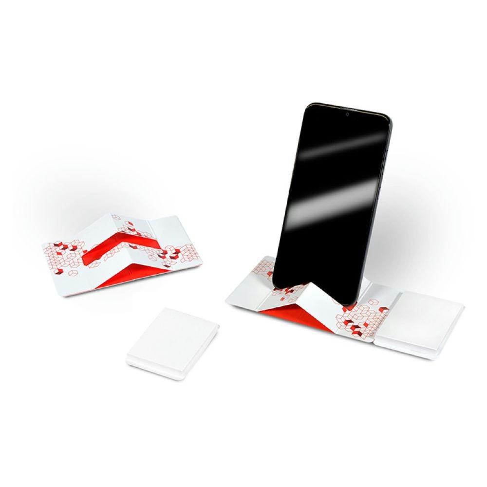 Dieses Haftset mit integriertem Smartphonehalter vervollständigt den Schreibtisch nachhaltig mit einer abtrennbaren Haftnotiz oder einem Markerset. Flachliegend geliefert eignet sich dieses Werbemittel auch ideal als Mailingverstärker.