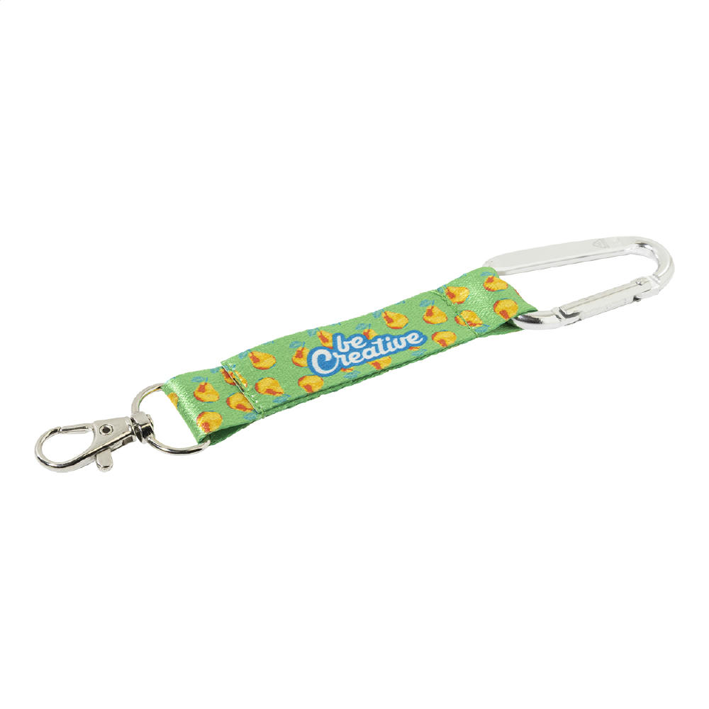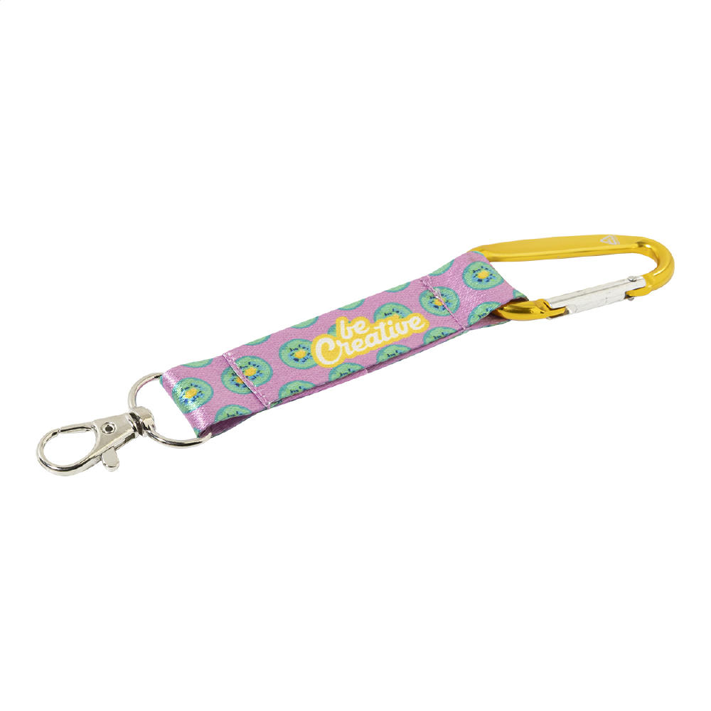 Individueller Mini-Schlüsselanhänger aus RPET-Polyester inkl. beidseitigem Sublimationsdruck. Mit kleinem Metallkarabiner und großem Karabinerhaken aus recyceltem Aluminium. Mindestmenge: 100 Stk.