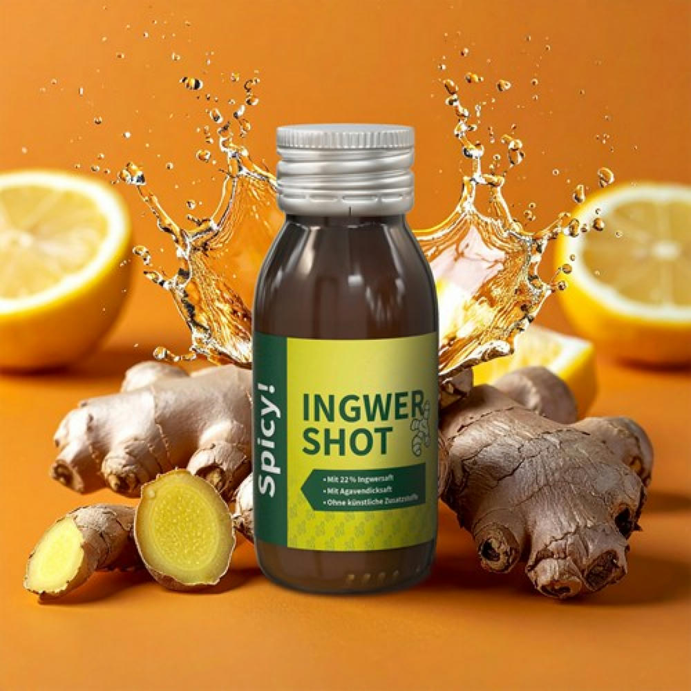 Er enthält 22% Ingwersaft, wird mit Agavendicksaft leicht gesüßt und mit frischen Zitronenzellen vollmundig abgerundet. Mit seinem charakteristisch-scharfen Aroma ist Ingwer seit langem geschätzt – vor allem für seinen einzigartigen Geschmack. Die Kombination mit Zitrone und Agave macht den Shot zu einem beliebten Begleiter für bewusste Genussmomente. Preis inkl. 4c-bedrucktem Etikett.