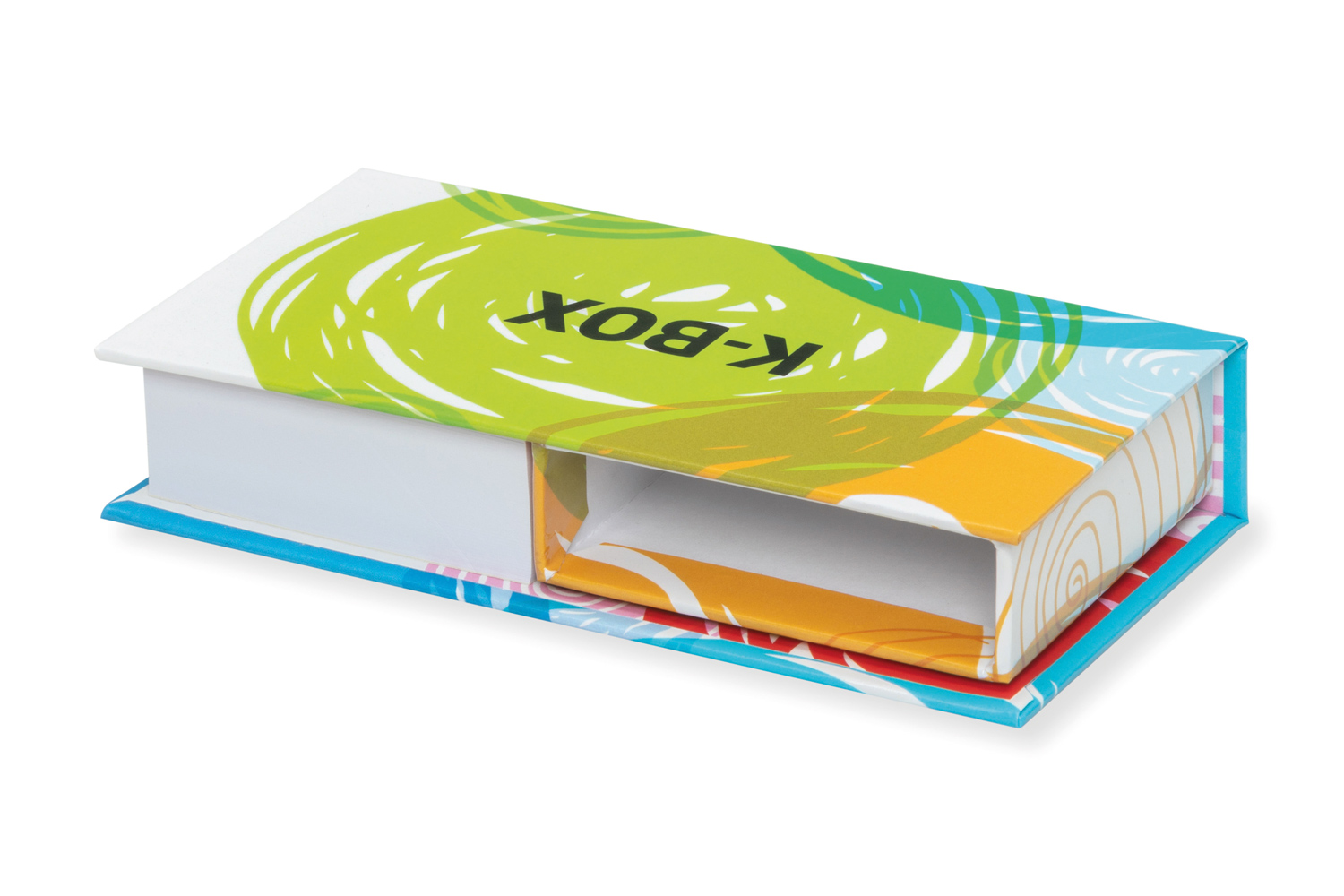 Inhalt: Notizblock (225 Blatt), Indexstreifen (5 x 25 St.) und Ablage für Schreibgeräte. Einzeln mit neutraler Banderole verschlossen. Außen- und Innenflächen der Box 4c-gestaltbar, Notizblock/Haftnotizen 1–2c bedruckbar. Preis inkl. Werbeanbringung.