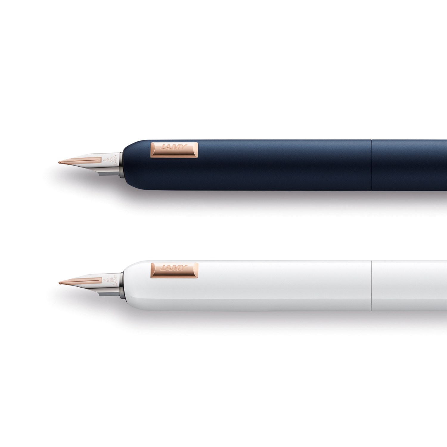 Drehfüllhalter mit versenkbarer Feder. Ganzmetallkorpus, mattdunkelblau lackiert oder Lack-Finish glanzweiß, Details mit Roségold veredelt.