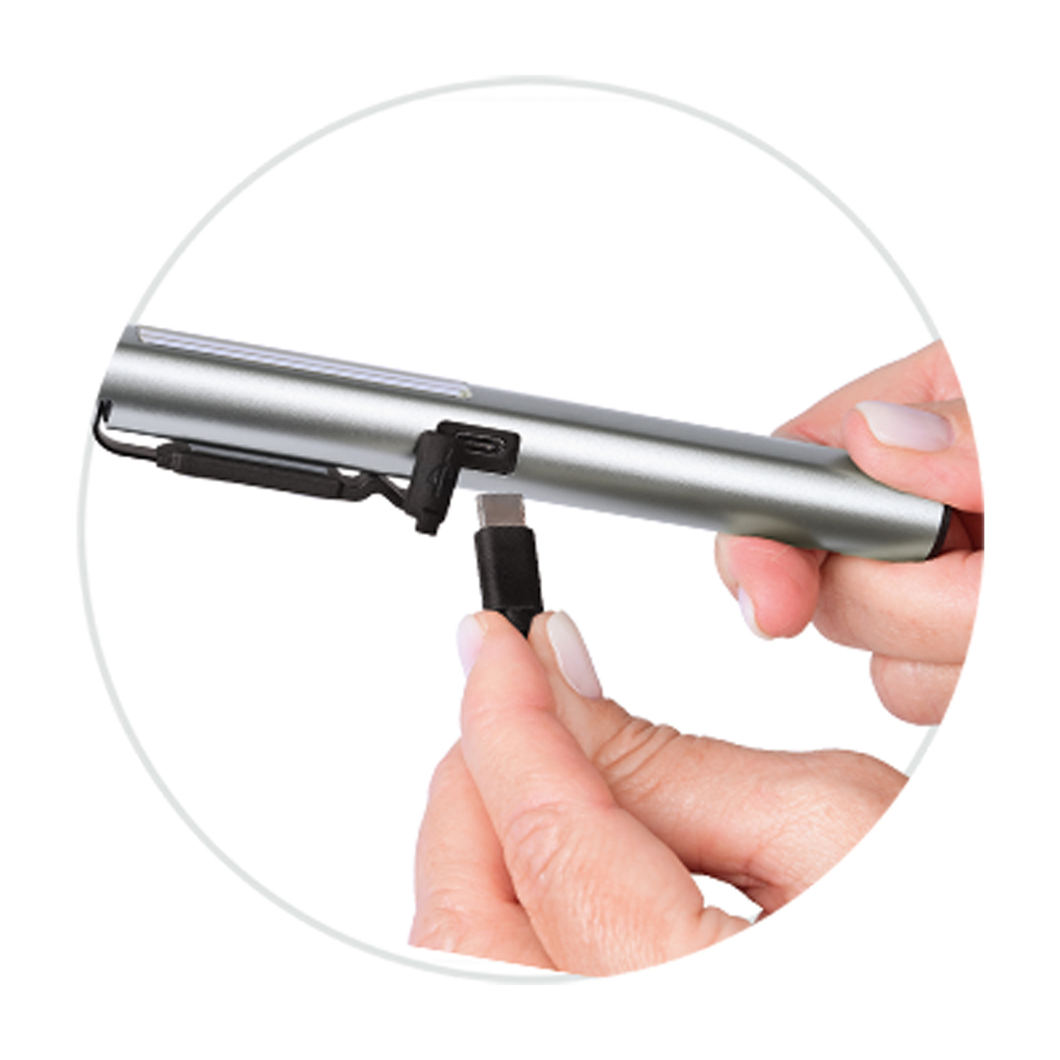 Gehäuse: Aluminium eloxiert. Leuchtmittel: Frontleuchte 5 W COB LED, Inspektionsleuchte 3 W LED, Laser 650 nm, UV-Licht 365 nm. Lichtwerte: Frontleuchte 450 Lumen, Inspektionsleuchte 140 Lumen. Ladezeit: ca. 3 Stunden. Leuchtdauer: ca. 2,5 Stunden (Frontleuchte 450 Lumen), ca. 2,5 Stunden (Inspektionsleuchte 140 Lumen), ca. 4 Stunden (UV-Licht). Leuchtmodi: Frontleuchte 100 % Power weißes Licht dimmbar, Inspektionsleuchte 100 % Power weißes Licht dimmbar, UV-Licht blau dimmbar, Laser rot. Equipment: 120° drehbarer Clip mit starkem Magnet, Ladekontroll-LED, USB (Typ A) / USB (Typ C) Ladekabel (50 cm Länge). Schutzklasse: IPX2. Stromversorgung: 3,7V 800mAh Li-Ionen Akku Typ 14500 (inkl.). Verpackung: schwarze Geschenkverpackung.