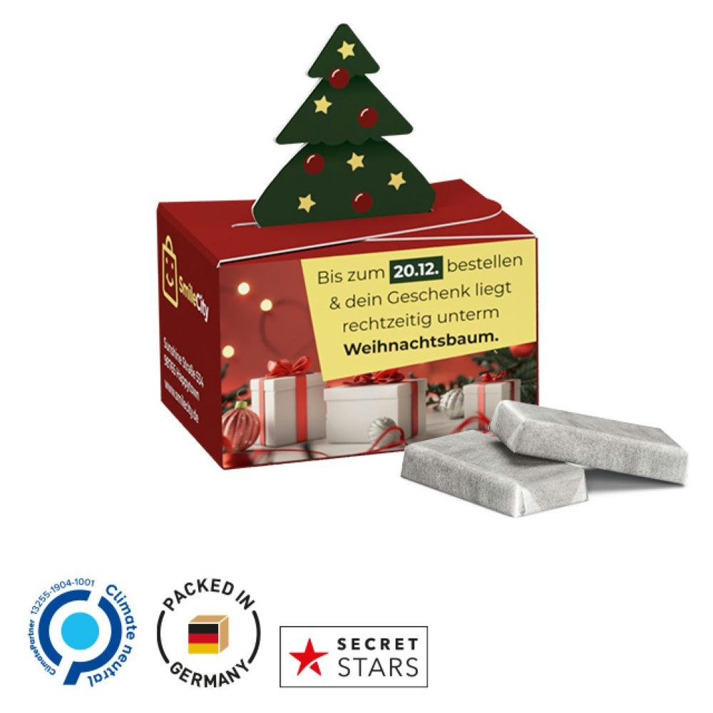 Lindor Milchkugel in einer Werbebox aus weißem Karton, Verschluss mit einem aufgestellten Tannenbaum, Box individuell bedruckt. Inhalt: 1 LINDOR Milchkugel, 12,5 g. Saisonartikel - solange der Vorrat reicht!