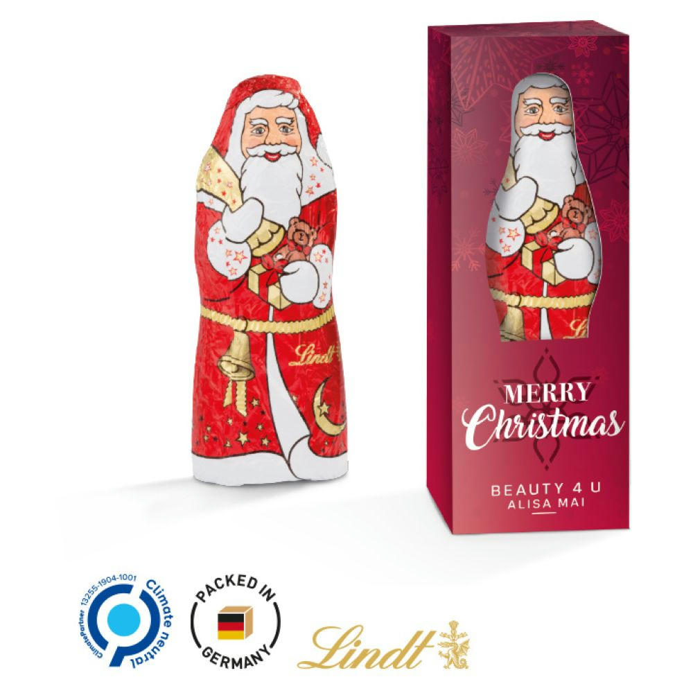 Lindt Schoko Weihnachtsmann in Werbebox aus weißem Karton, individuell bedruckt. Inhalt: Lindt Weihnachtsmann aus Vollmilchschokolade, 40 g. Saisonartikel - solange der Vorrat reicht!
