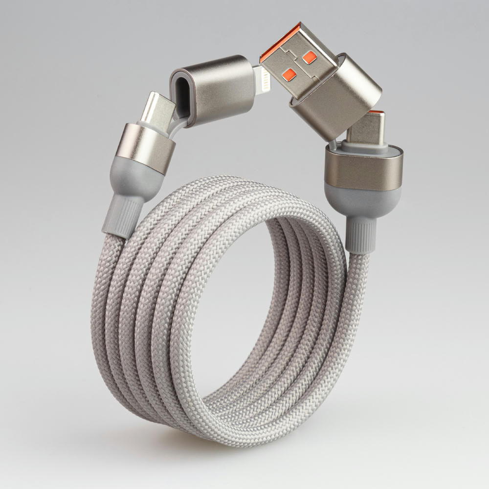 Die All-in-One-Ladelösung für moderne Geräte: Dank vier integrierter Anschlüsse (2× USB-C, 1× Lightning, 1× USB-A) bietet es maximale Flexibilität für Android, iOS und viele weitere Geräte. Die hochwertige Nylonummantelung schützt vor Kabelbruch, das magnetische Aufrollsystem sorgt für Ordnung und Langlebigkeit im Alltag. Metallkomponenten – Gunmetal. Veredlung möglich (z. B. per Lasergravur auf dem Metallgehäuse). Verpackt in nachhaltiger Kraftkartonage.