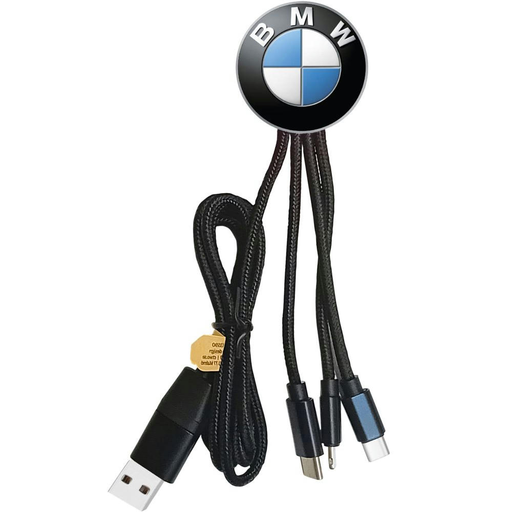 Innovatives 5-in-1 Ladekabel mit vielseitigen Anschlüssen: USB-A mit einem USB Typ C Adapter als Eingang und Ausgänge für iPhone Lightning, Type C sowie Micro USB. Kabel und Stecker wahlweise in Schwarz oder Silber. Der mittlere Teil kann in Größe, Farbe und Design individuell gestaltet werden – die Optionen sind nahezu unbegrenzt! Leistung: 5V / 2.1A; Länge: ca. 110 cm.
