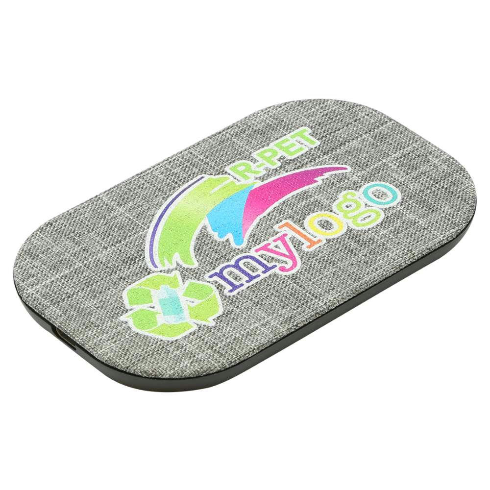 Kabelloses Laden mit der aus 1,5 1-Liter recycelten PET-Flaschen gefertigten rPET TEX QI-Ladestation mit hellgrauer textiler Oberfläche. / USB auf Micro USB-Ladekabel im Preis enthalten / Leistung 10 Watt = 2A / Material: rPET / Output: 5V = 2A / verpackt im braunen Recycling-Karton.