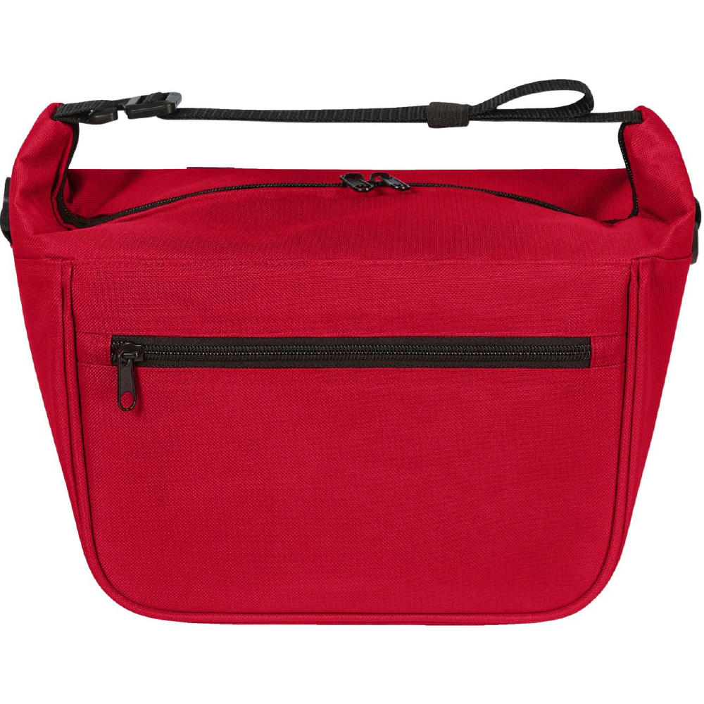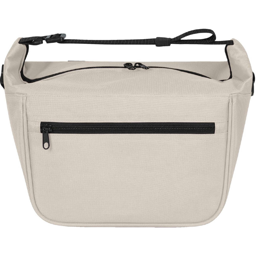 moderne Kühltasche; Hauptfach mit 2-Wege-Reißverschluss; großzügige Polsterung; innen abwaschbar; einseitig lösbarer, längenverstellbarer Träger mit Gummilasche zur Gurtfixierung; beidseitig D-Ringe zu Befestigung z.B.: für optionalen Schultergurt* oder Schlüssel; Bodenfüße; rückseitig Schlaufen zur Befestigung am Fahrradlenker
