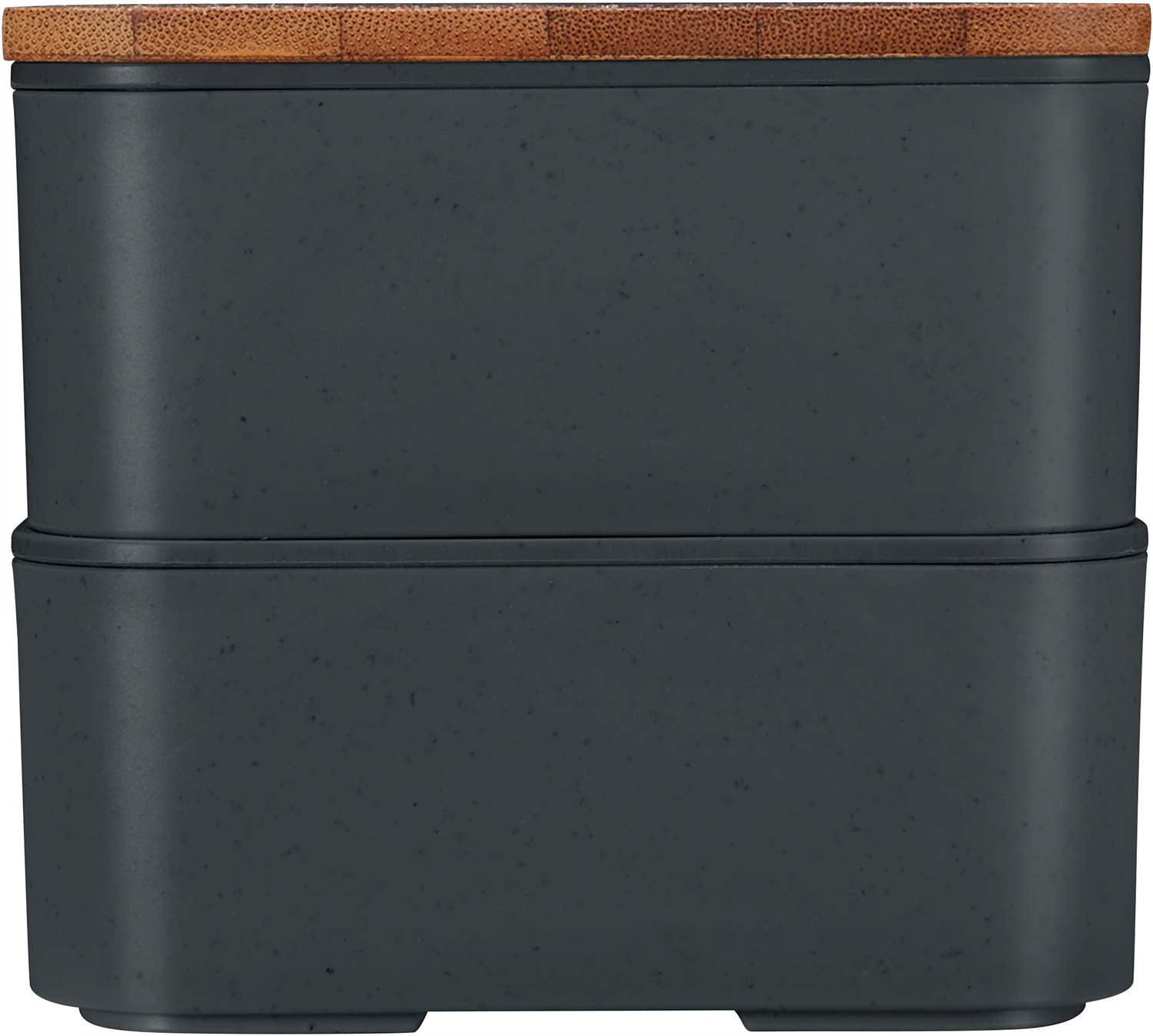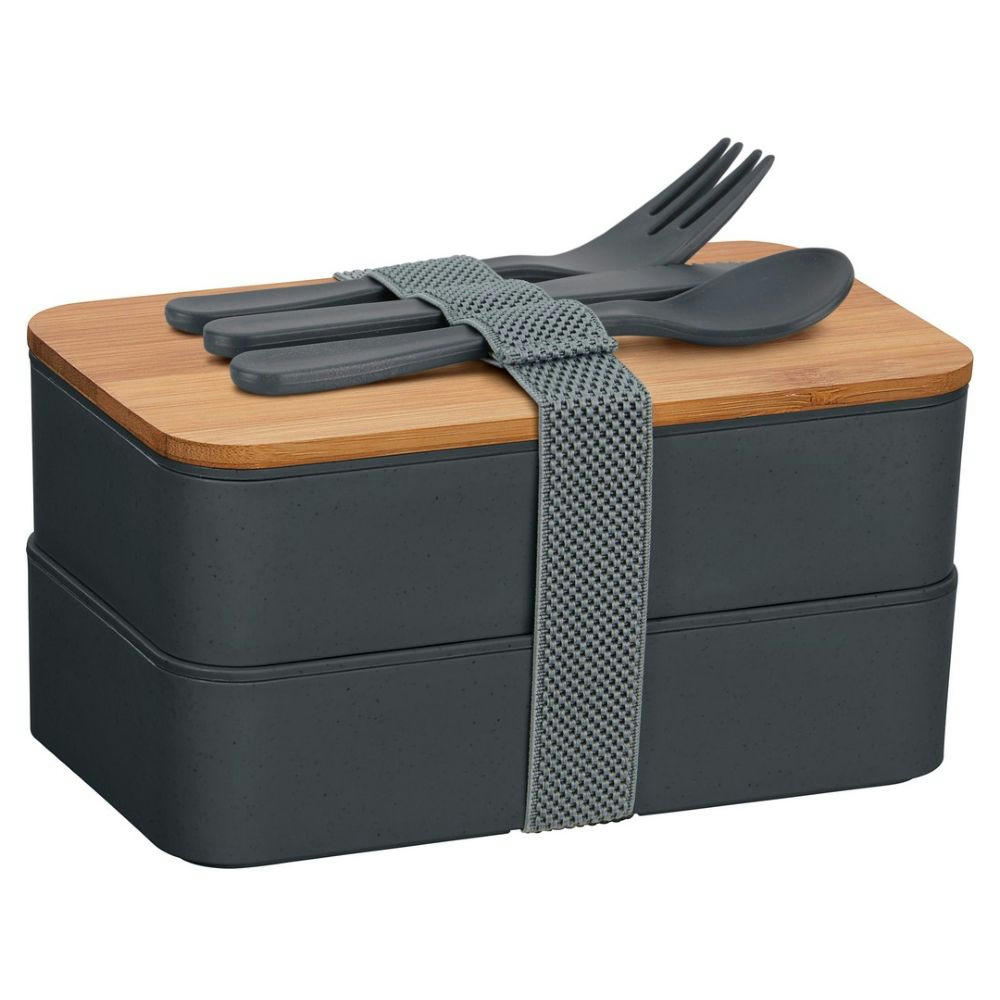 Nachhaltiges Doppel – mit Bambusdeckel und Besteck. Mit Elastikband und Besteckset.