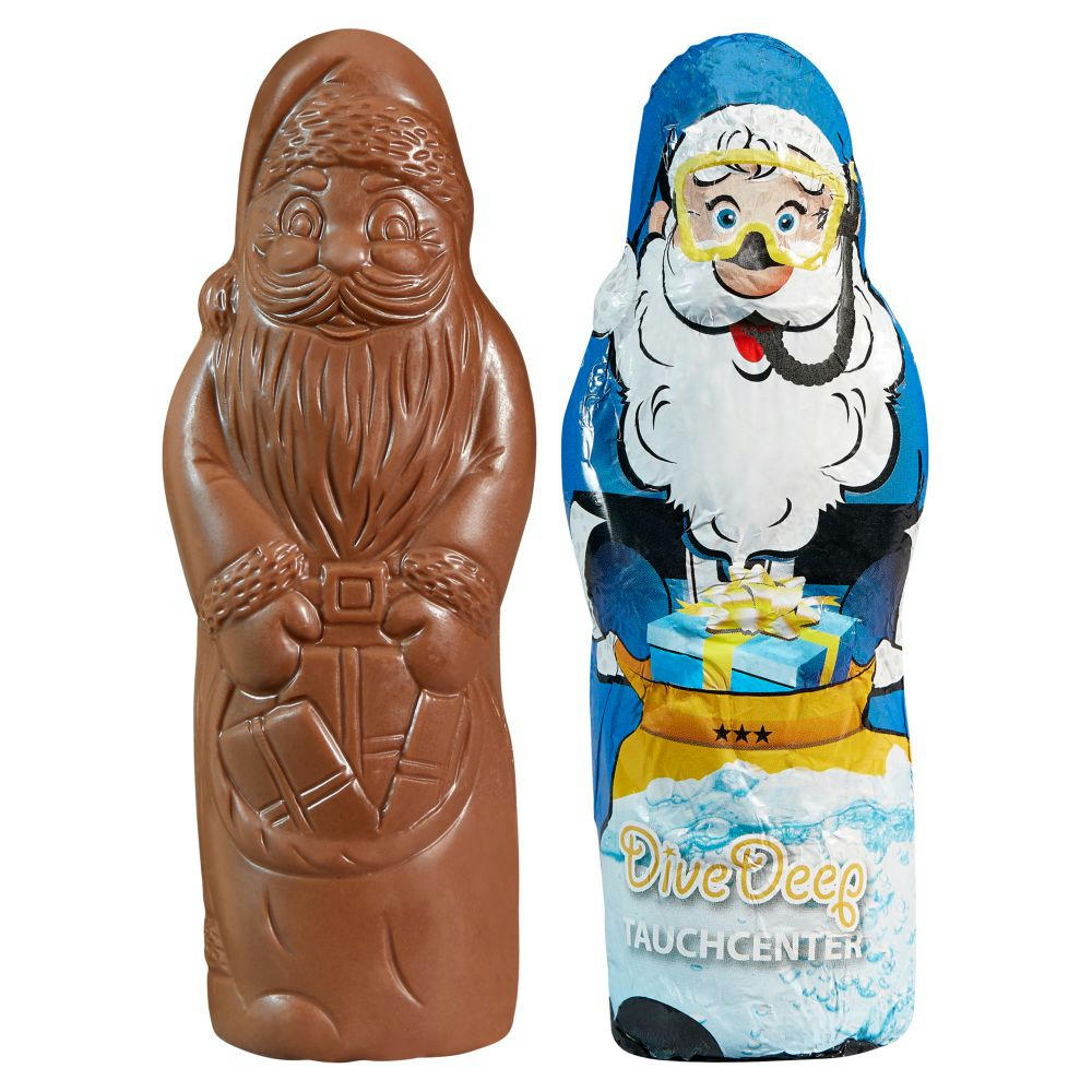 Schoko-Weihnachtsmann, Hohlfigur, einzeln in individuell bedruckte Alufolie (weiß, silber oder gold) gewickelt. Inhalt: 1 Stück à ca. 40 g.