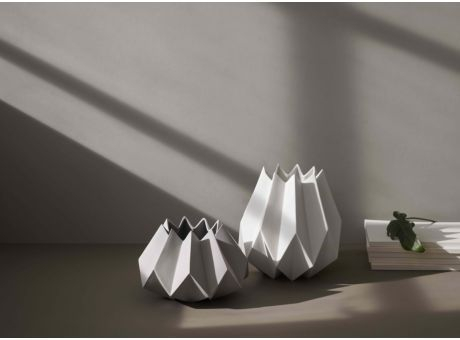 Die FOLDED VASE der Designerin Amanda Betz übernimmt die Struktur eines Blumenstraußes und lehnt zugleich in der 'gefalteten' Formengebung an die japanische Papierfalttechnik des Origami an. Die matte Oberfläche und Textur des Porzellans wirkt wie luftiges Papier. Selbst ohne Blumen wirkt die Vase als skulpturales Designstück. Ein Strauß Blumen wird durch das geometrische Design erst hervorgehoben. Erhältlich in 2 Größen und auch in der Kombination ein Hingucker in jedem Wohnraum.