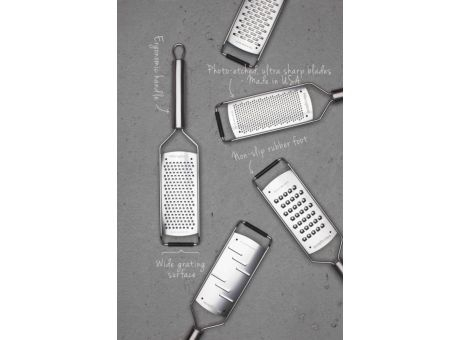Die Microplane Professional Serie besticht durch Eleganz und ihr klares Design aus purem Edelstahl und zeichnet sich wie alle anderen Microplane-Reiben durch die gewohnten photo-geätzten Klingen - made in USA - aus, durch deren Schärfe Sie Lebensmittel zerschneiden anstatt sie zu zerdrücken. Aroma und Geschmack können sich auf diese Weise voll entfalten. Mit der feinen Klinge zesten Sie Zitrusschalen und schneiden Hartkäse, Gewürze wie Muskatnuss, Zimt und Schokolade, Ingwer  Knoblauch uvm. präzise und sehr fein. Ohne jeglichen Kraftaufwand und durch die breite Reibfläche reiben Sie effizient und wunschgemäß. Folgende Klingenausführungen sind in dieser Serie erhältlich: Grob, 2-Wege-Schneide, Fein, Große Raspel, Sehr Grob.