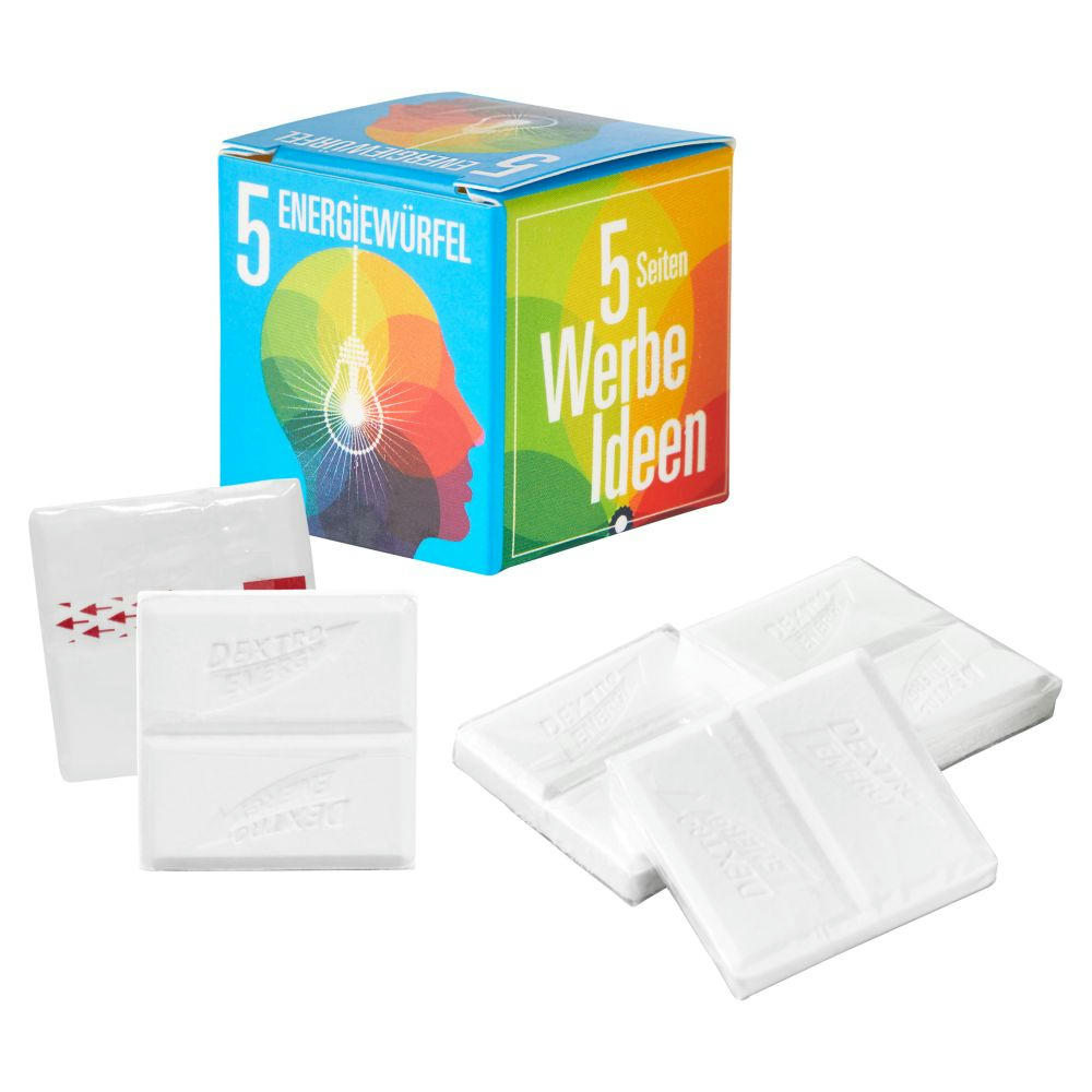 Gefüllte weiße Mini-Kartonage in Würfelform. Inhalt: 5 St. DEXTRO ENERGY* à ca. 5,75 g. Haltbarkeit: ca. 12 Monate. Weitere Füllvarianten auf Anfrage. Preis inkl. 4c-Druck