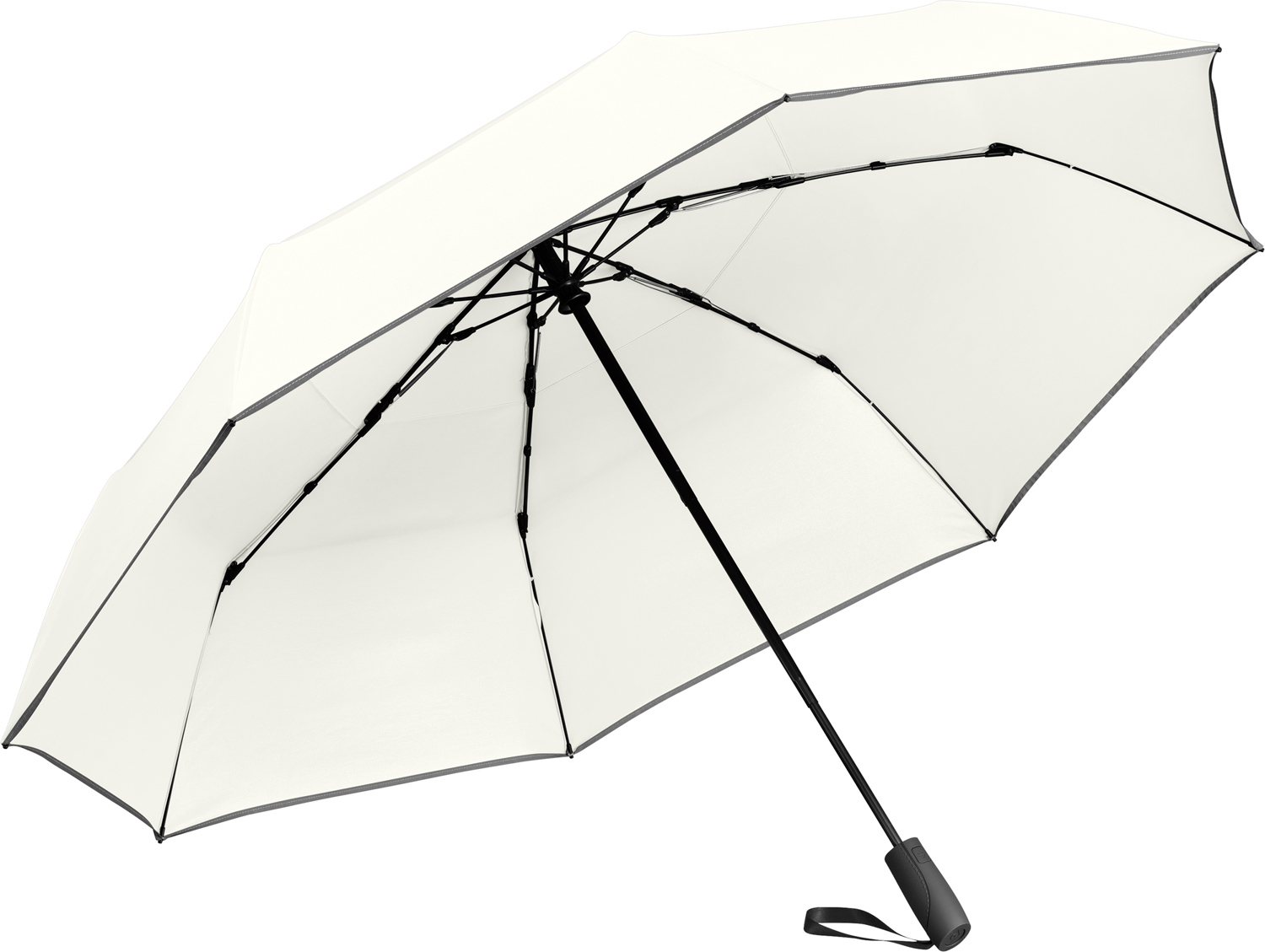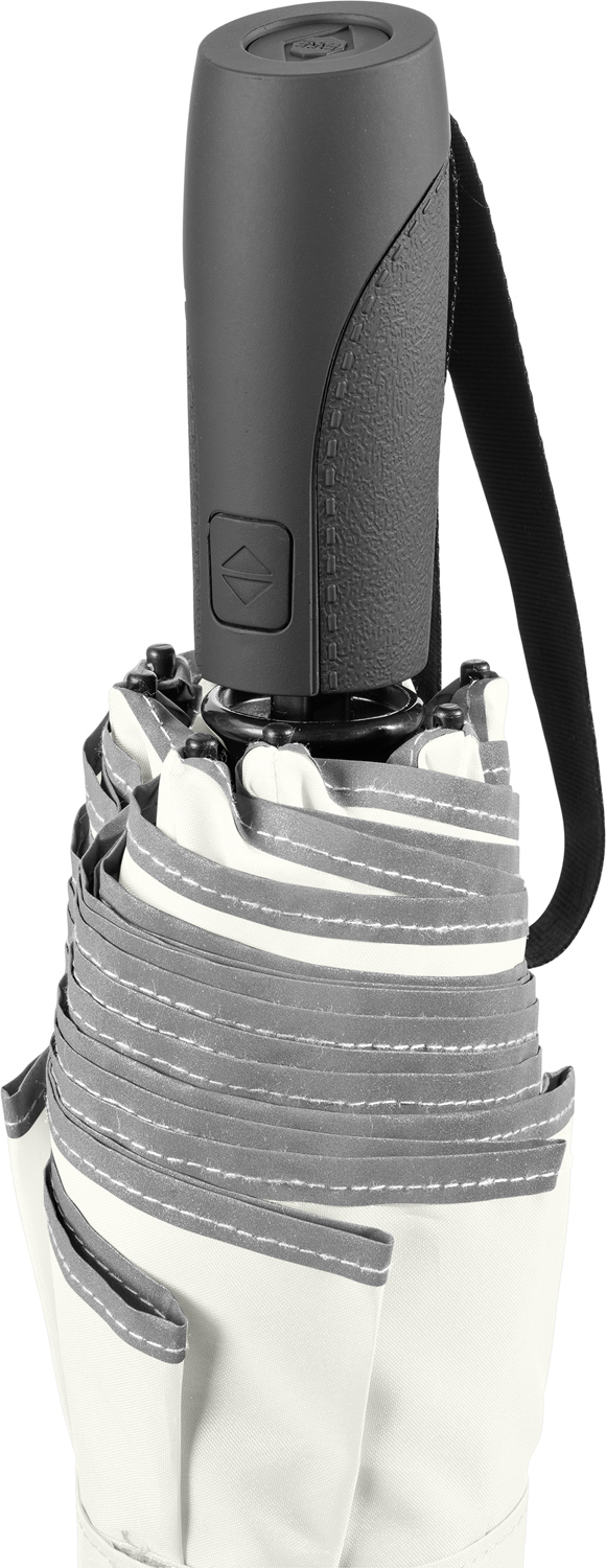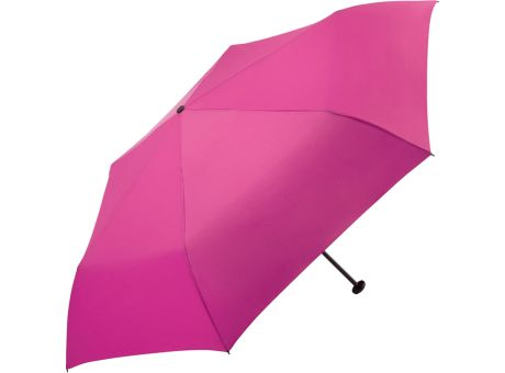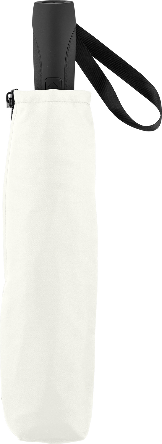 Filigraner Handöffner-Taschenschirm in ultraleichter Ausführung. Einfache Handhabung durch Sicherheitsschieber, hochwertiges Windproof-PLUS-System für eine maximale Gestell-Flexibilität bei stärkeren Windböen, schwarzer Aluminiumstock, Polyester-Pongee Bezugsmaterial aus recycelten Kunststoffen, extra leichter Bezug, matt-schwarzer Kunststoffgriff mit Werbeanbringungsmöglichkeit, handtaschentauglich durch ultraleichtes Gewicht und kompakte Größe