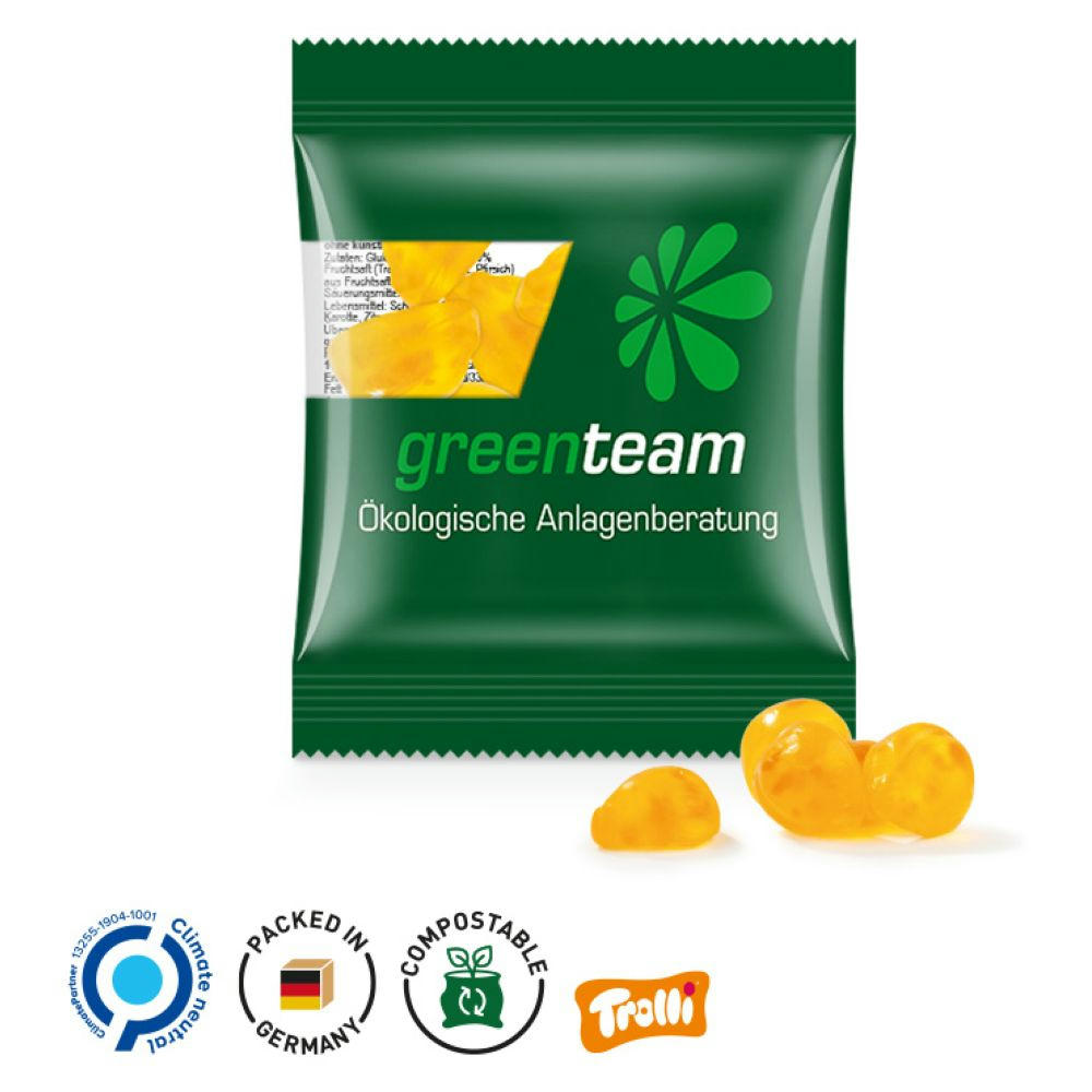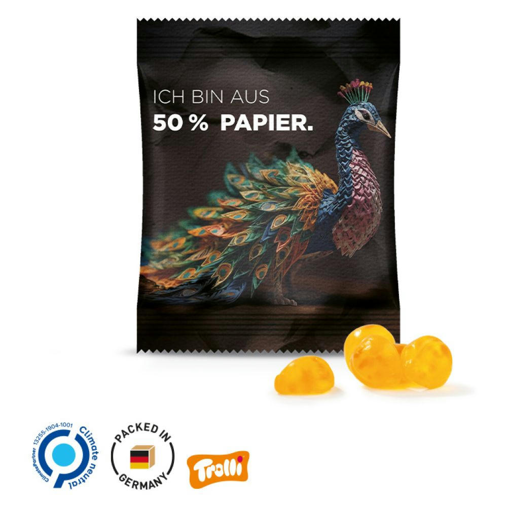 Trolli Fruchtgummi in Tüte aus weißem, recyclingfähigem Papier, individuell bedruckt. Inhalt: Trolli Vitamin-Fruchtgummi, mit Fruchtsaft, fruchtigen Stückchen und 10 Vitaminen, in der Geschmacksrichtung Pfirsich, 15 g.