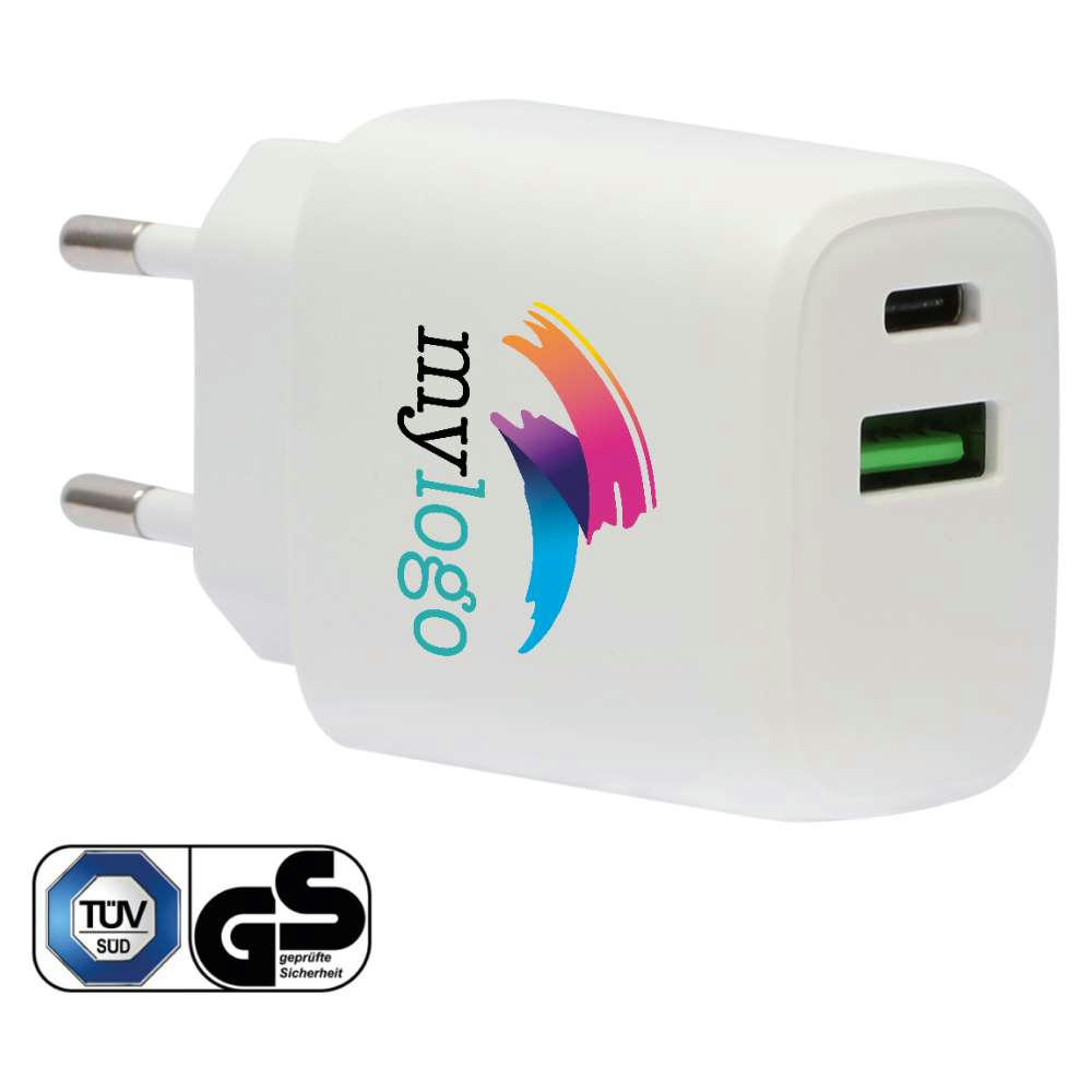 Schnelle Power für Ihr Smartphone, Tablet oder Notebook. Adapter mit Power Delivery Fastcharge in TÜV GS-zertifizierter Qualität. USB C und USB A 3.0. Input: 100-240 V, 50/60 Hz 0.5 A / PD, Output gesamt: 5V = 3A.