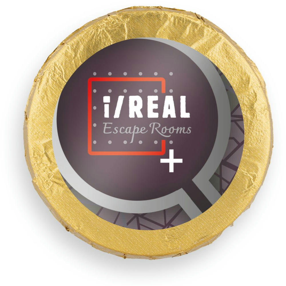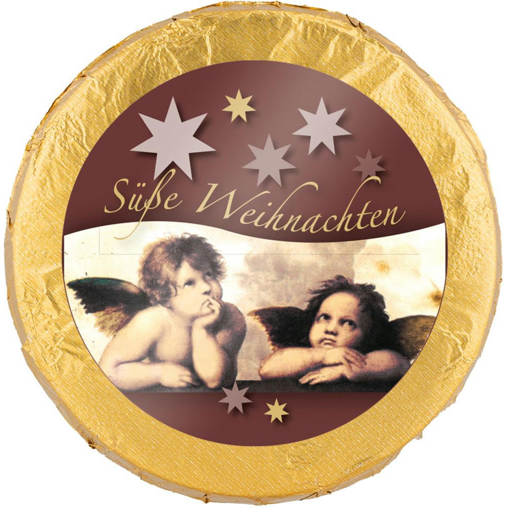 Hochwertige Schokoladen-Taler gefüllt mit zartschmelzendem Nougat und Haselnuss-Crisps, in goldenem Stanniolpapier. Haltbarkeit: ca. 6 Monate