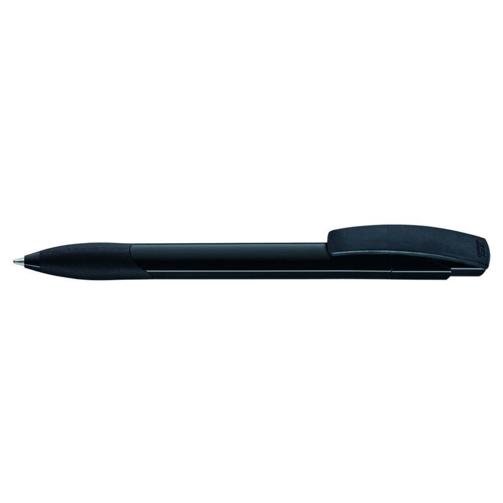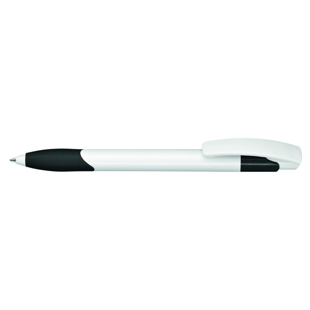 Druckkugelschreiber mit gedeckt glänzendem Schaft und Clipdrücker in weiß. Gummigriffzone und Manschette farbig.