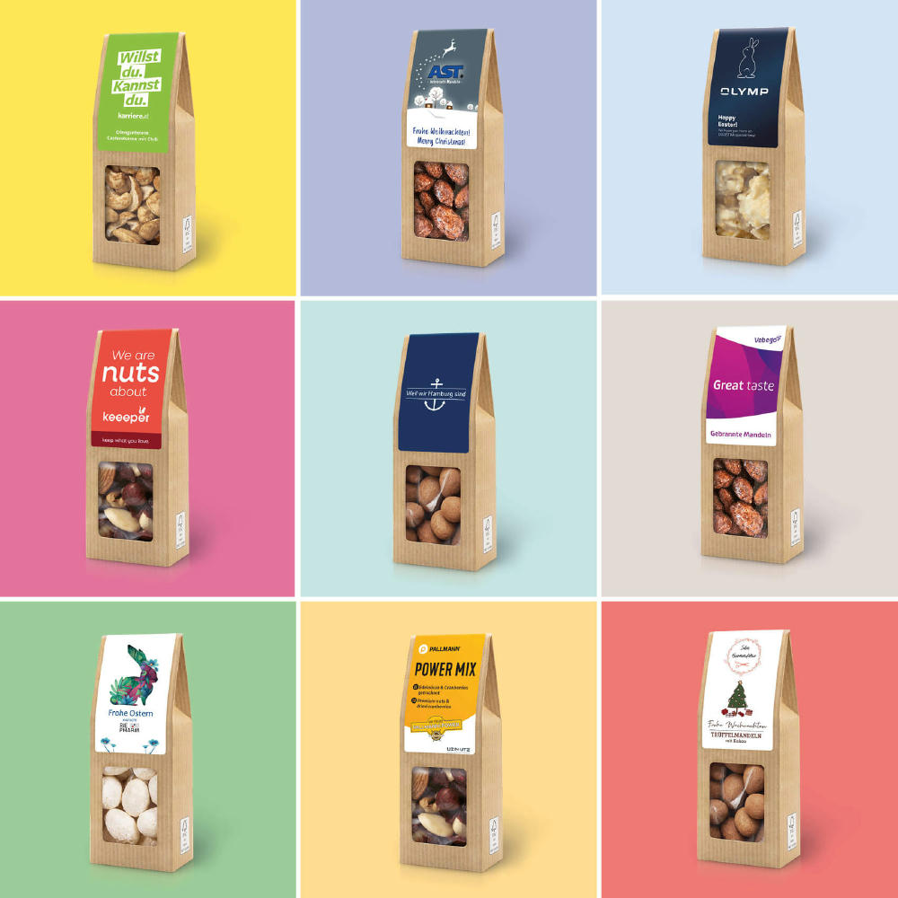 Ab 250 Stück mit Ihrem Motiv im 4c Druck auf dem Etikett der Faltschachtel, ab 2.500 Stück vollflächig bedruckt im Offsetdruck: Der aufmerksamkeitsstarke Bestseller. Die Faltschachtel als nachhaltiges Premium-Giveaway. Hier kommt ein Kokos Snack in der perfekten Mini-Osterei-Form. Und einem Geschmack, der perfekt die Süße der weißen Schokolade, die Aromatik der Kokosflocken und die herbe Mandelnote verbindet.