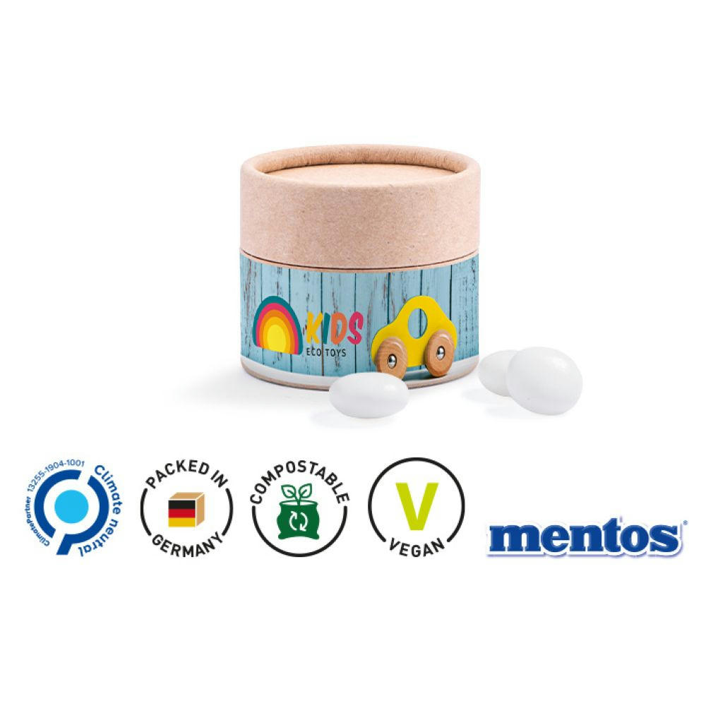 Papierdose Eco Mini biologisch abbaubar, aus schnell nachwachsenden Rohstoffen, rundum mit Papieretikett, individuell bedruckt. Mit Originalitätsverschluss. Inhalt: Mentos Kaudragee Fruit, 50 g.