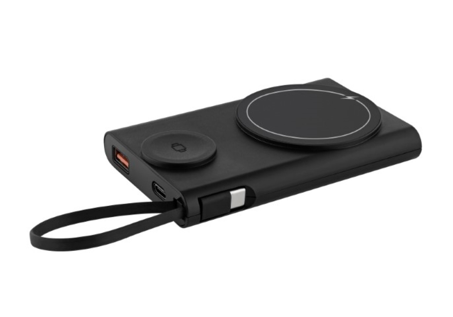 Leistung in einem kompakten Format. Mit PD (Power Delivery) 20 Watt Fast Charging Technologie (kabelgebunden) – Dualport In- oder Output. Schnelles kabelloses Laden per Magsafe® Wireless Fast Charging (15 Watt inkl. 3 Watt für Airpod®), zweites Induktionsfeld speziell für die Apple® Watch (2.5W) optimiert. Auch andere Geräte können mit dem s zusätzlich eingebauten Kabels (USB-C) sofort und überall mit Energie versorgt werden. Der integrierte Sicherheitskreislauf (SecuityCircuit) schützt vor Über-, Unterladung, Überspannung und Überhitzung. Hergestellt aus recycelten Materialien. Mit verstecktem Handyaufsteller. In Craft Paper Box.