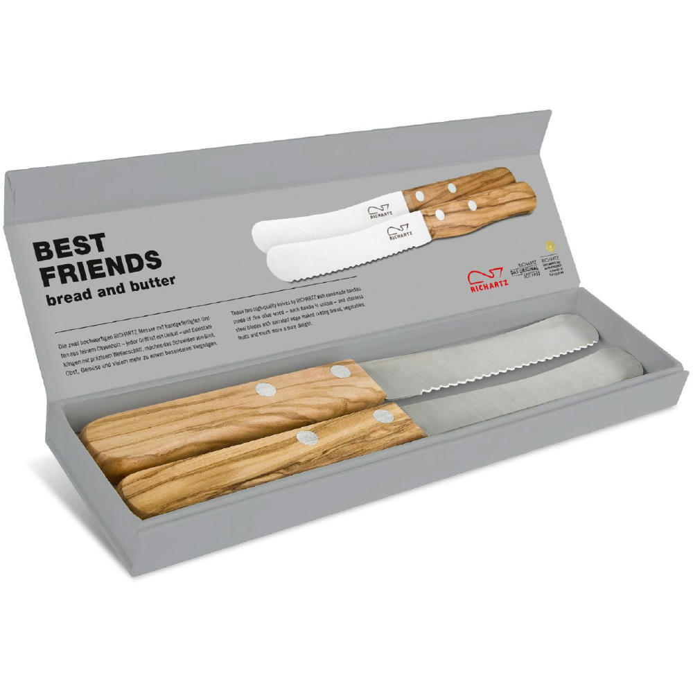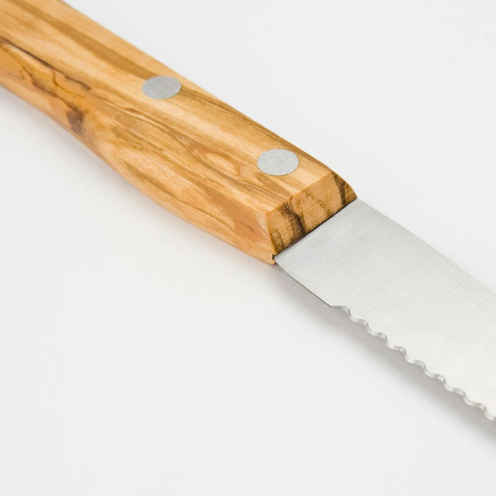 Zwei hochwertige Messer mit handgefertigten Griffen aus feinem Olivenholz – jeder Griff ist ein Unikat. Edelstahlklingen mit präzisem Wellenschliff. Ein Set, des jeden Tag Freude macht!