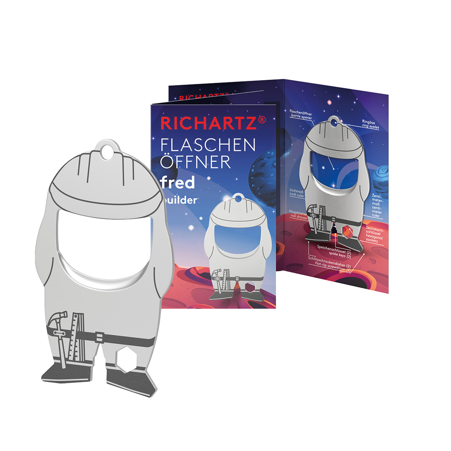 Überzeugt durch seine kompakte Form und passt daher an jeden Schlüsselbund. Der perfekt konstruierte Flaschenöffner löst jeden Kronkorken und mit 9 weiteren nützlichen Funktionen wird er schnell zum unverzichtbaren Begleiter im Alltag. Preis inkl. Lasergravur und individuell gestalteter Verpackung.