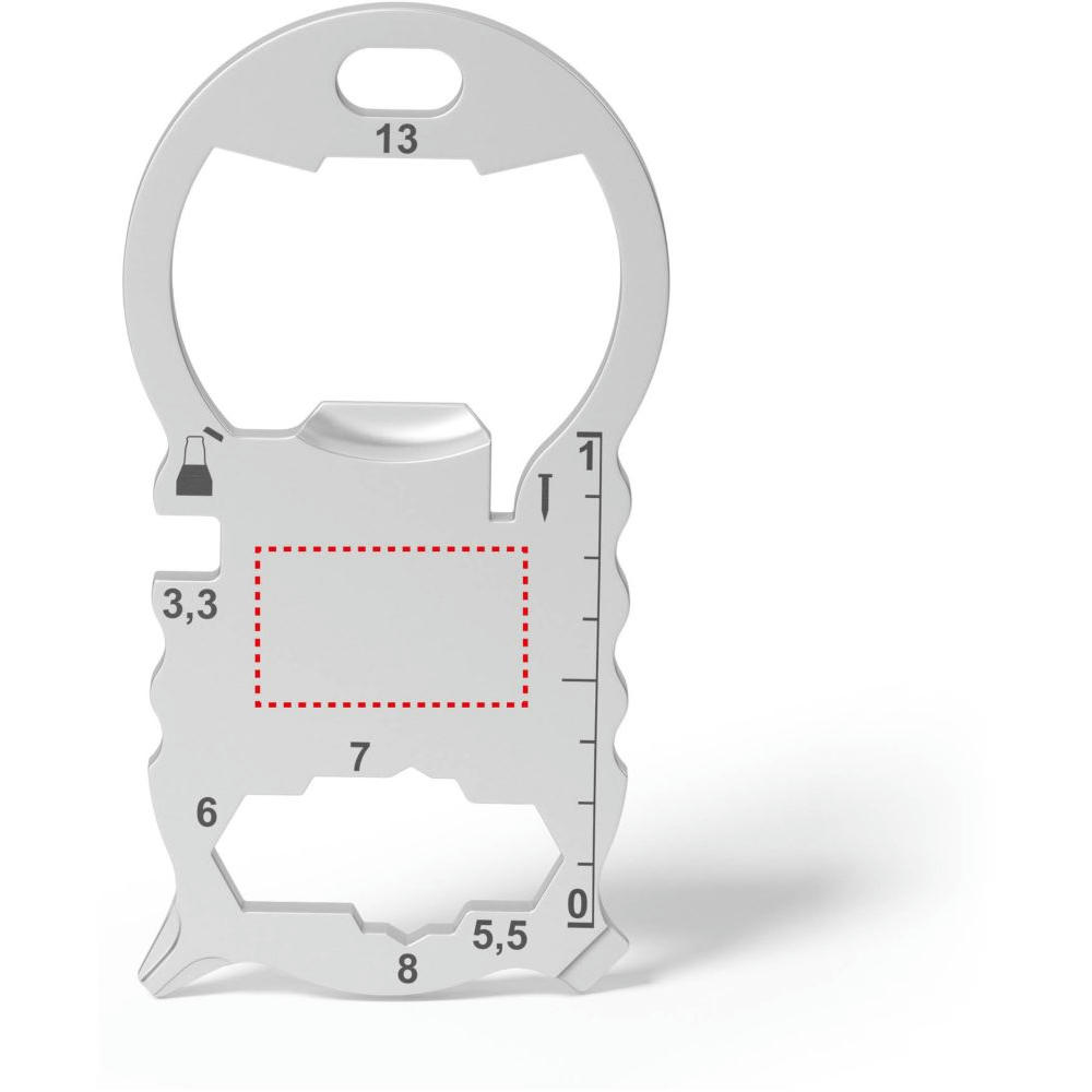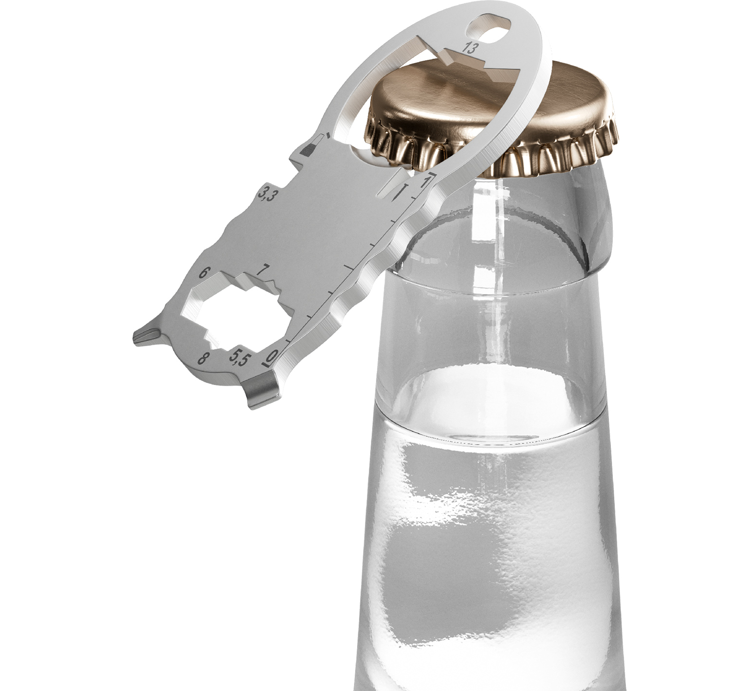 Kleines, kompaktes Multitool mit 13 Funktionen, aus hochwertigem, matt gestrahltem Edelstahl gefertigt. Passt an jeden Schlüsselbund. Inkl. Lasergravur und individuell gestalteter Verpackung.