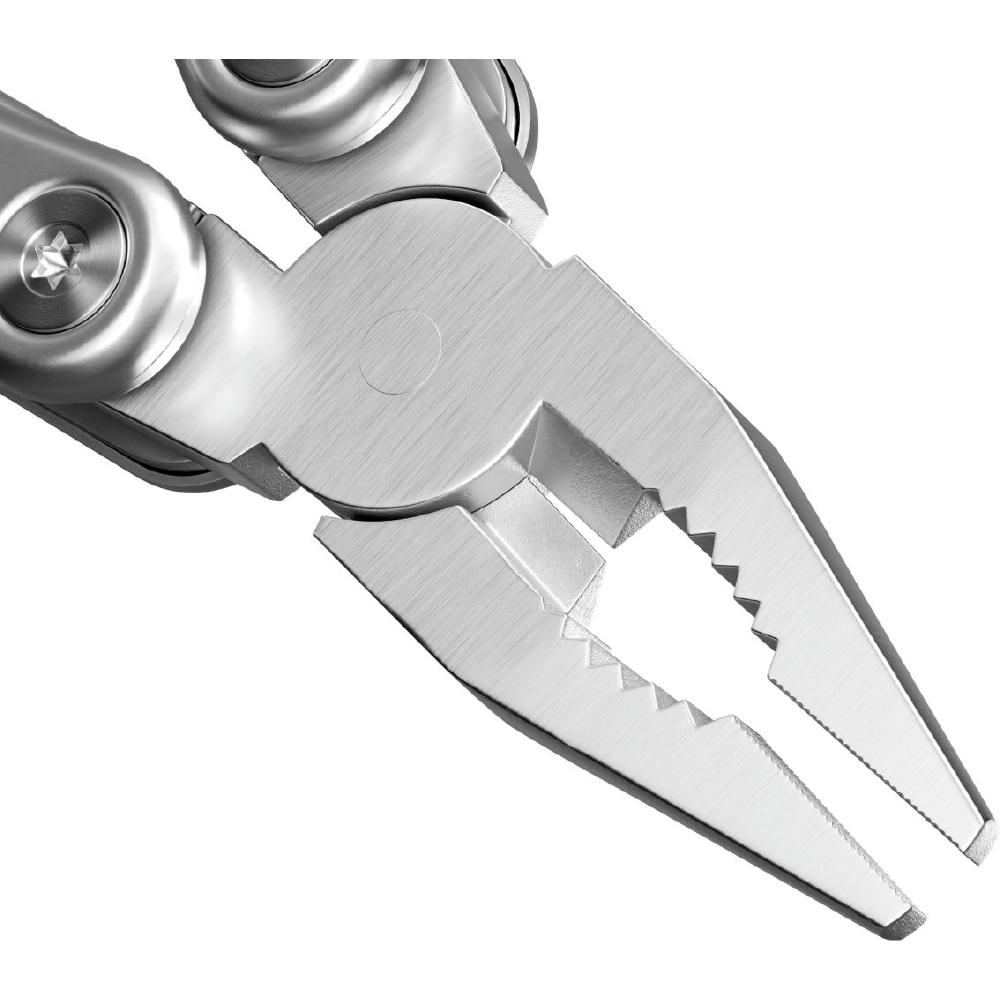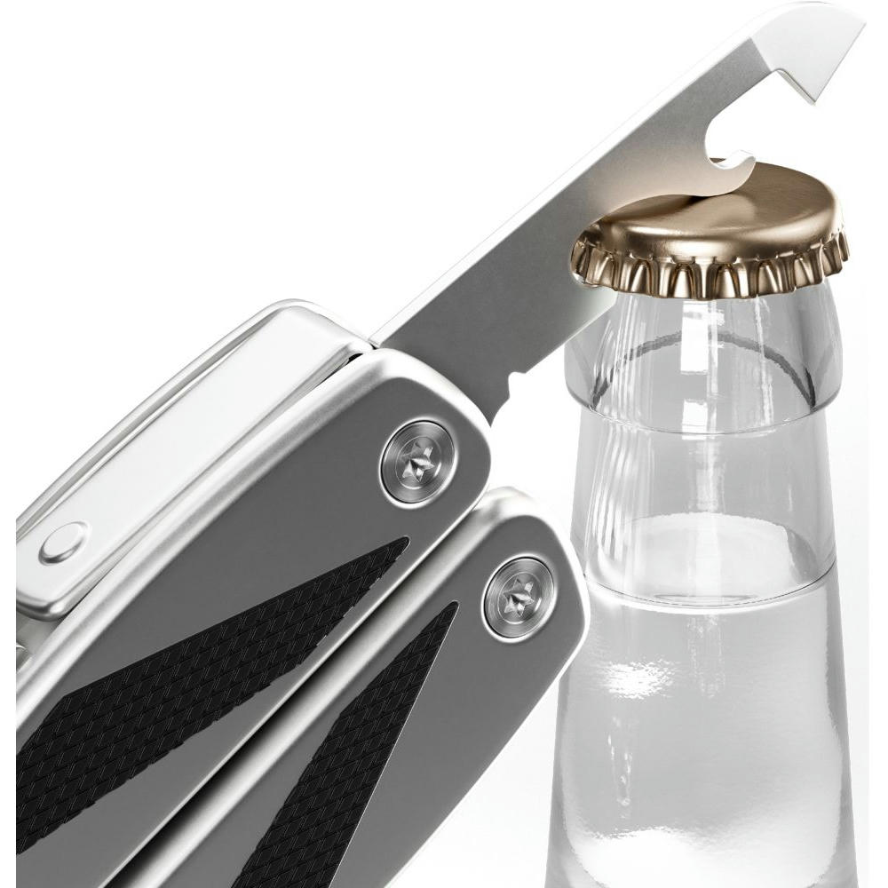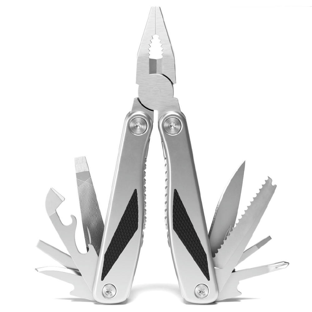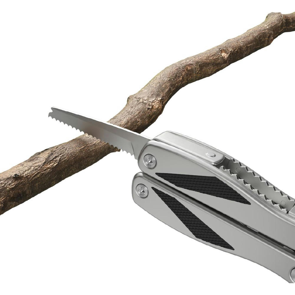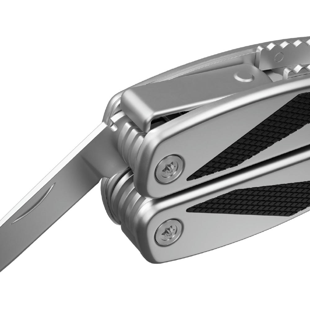Die matt gestrahlten modernen Edelstahlgriffe mit schwarzen Kunststoffeinlagen geben sicheren Halt bei jeder Arbeit. Die kräftige, gegossene Zange mit Drahtschneider, die große Klinge, die Metallfeile und viele weitere Funktionen, überzeugen im täglichen Gebrauch. Für ein besonders sicheres Arbeiten lassen sich alle ausklappbaren Funktionsteile arretieren. Mit schwarzer Gürteltasche. Ab 100 St. individuelle Gestaltung der Verpackung und Lasergravur auf Produkt gegen Aufpreis möglich.